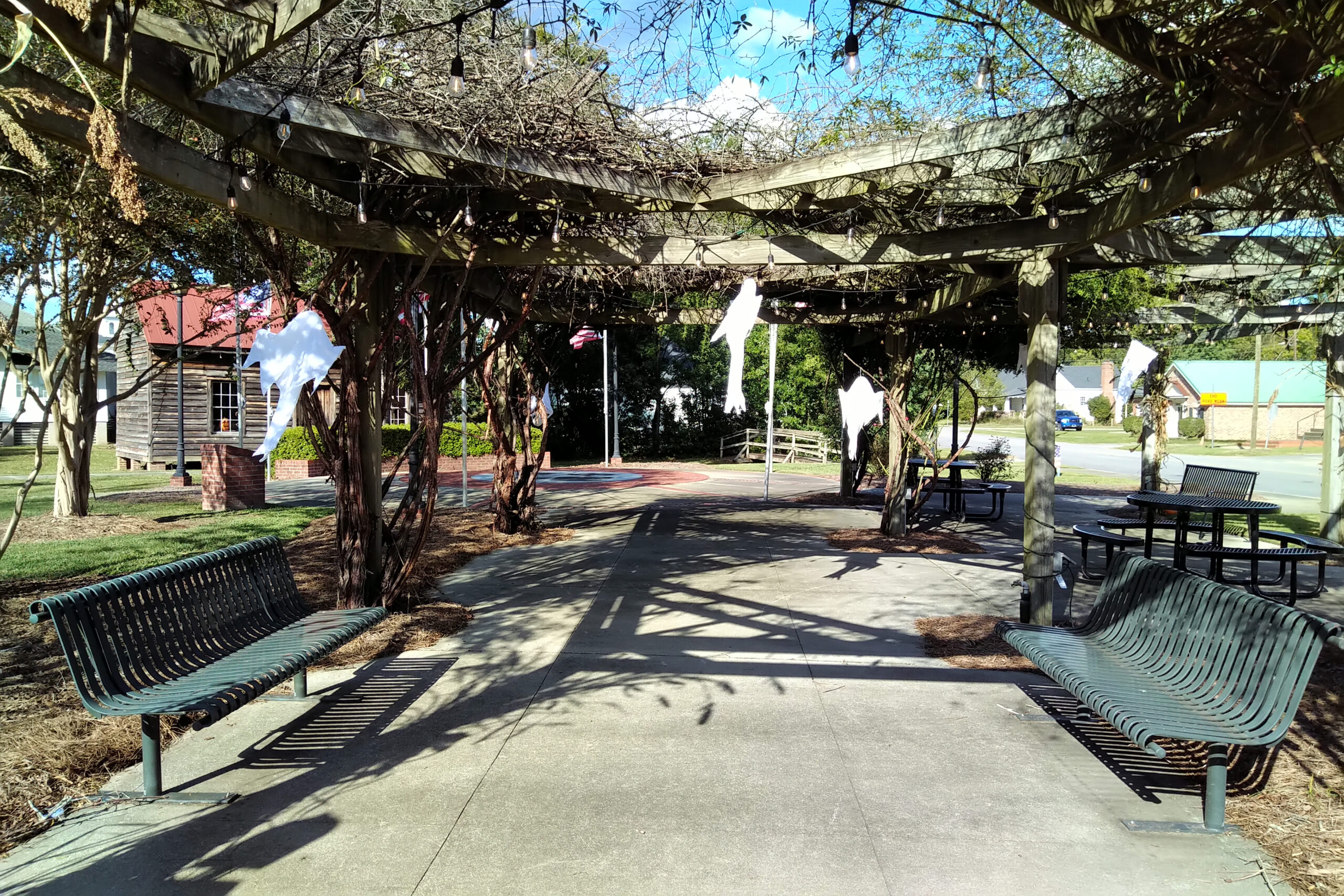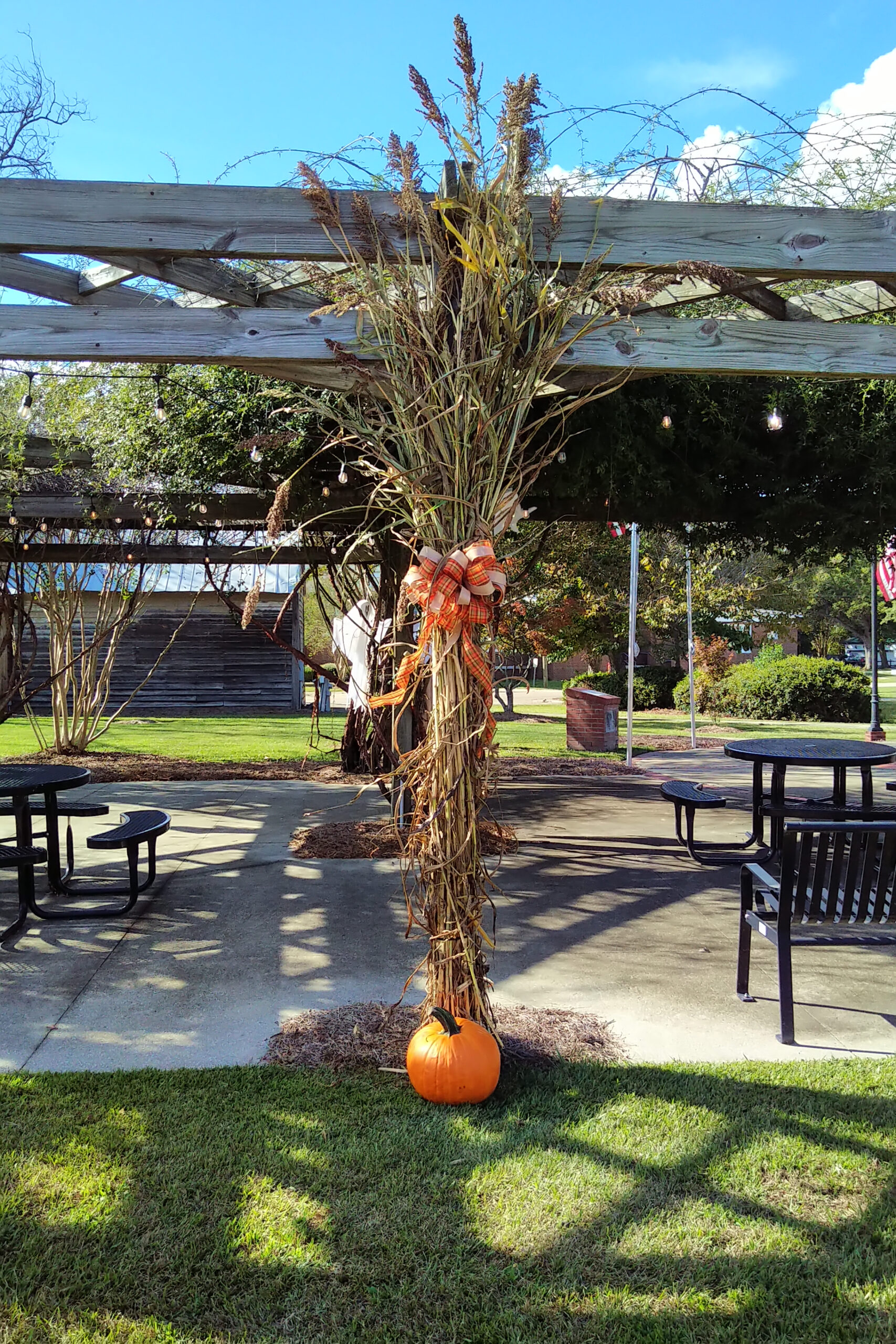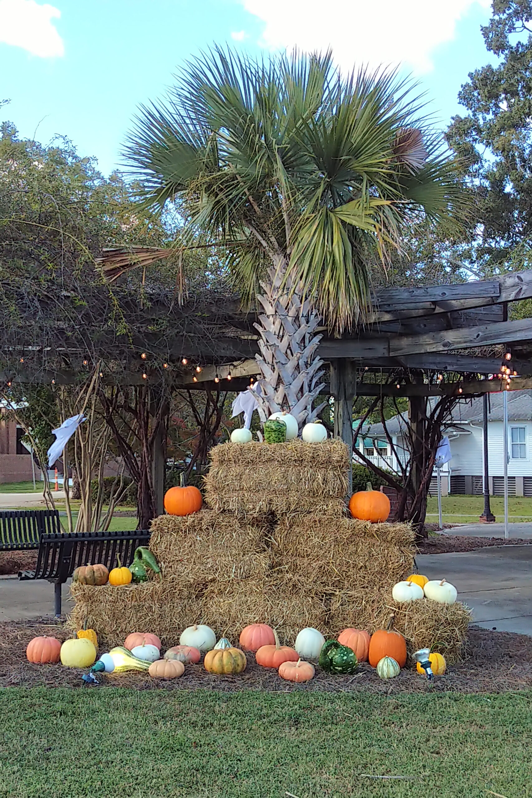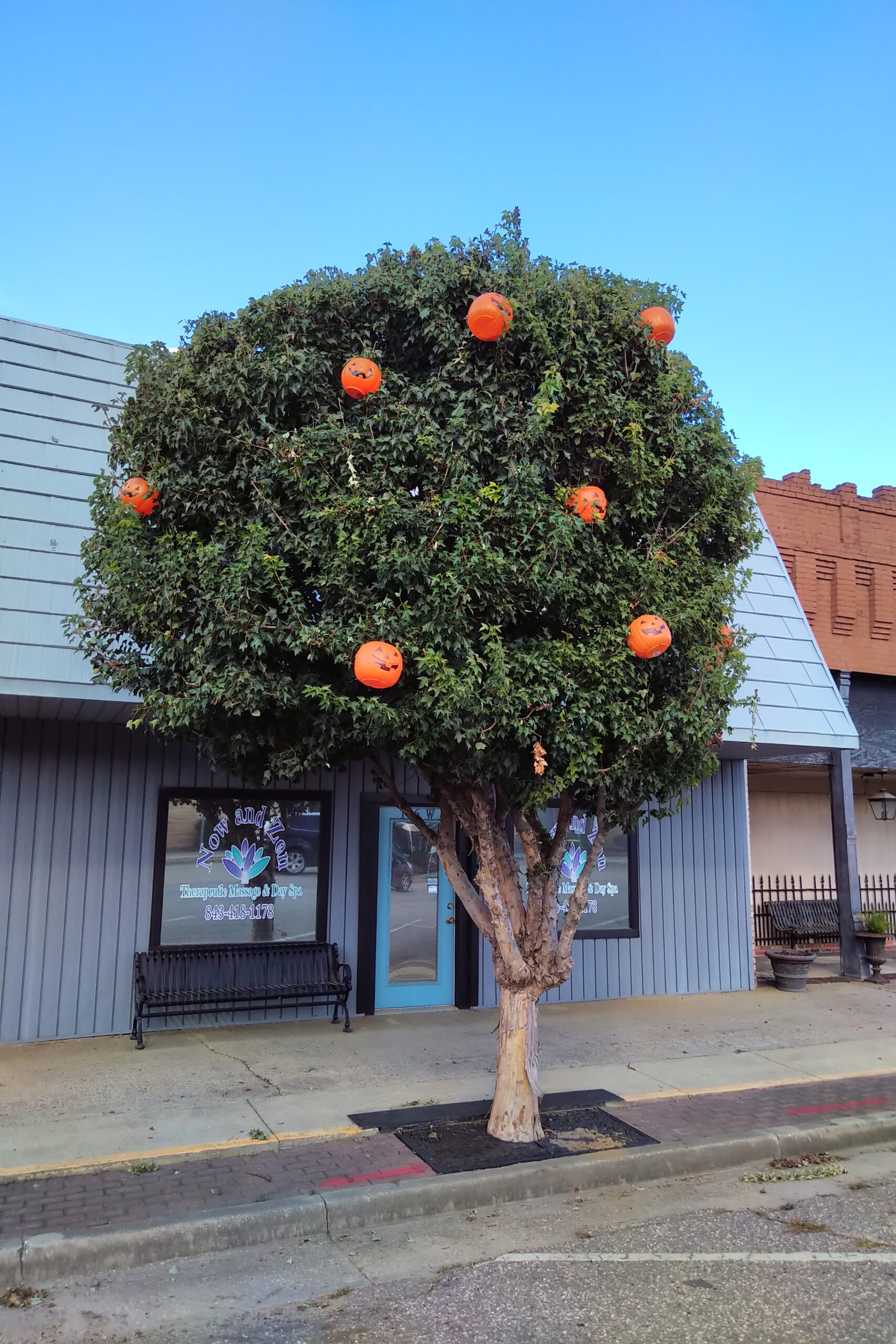 It’s beginning to look like Hallowe’en in downtown Latta. In the day, it’s a beautiful celebration of fall with pumpkins, mums, and touches of Hallowe’en with ghosts and skeletons. The Main Street Market is covered with spiders and cobwebs.
