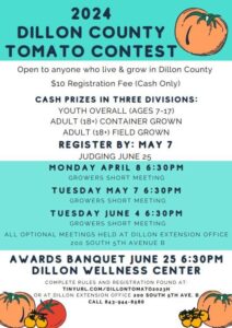 It’s that time of the year again for the 2024 Dillon County Tomato Contest. If you are interested in being a participant in the contest, please stop by the Dillon Extension office for an application to register before May 7th. Registration fees are $10 (Cash Only). There will also be a short meeting on April 8th at 6:30 p.m. to discuss more details of the contest. This year’s Tomato Contest will be hosted by their very own, Carmen Ketron.