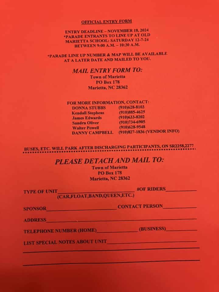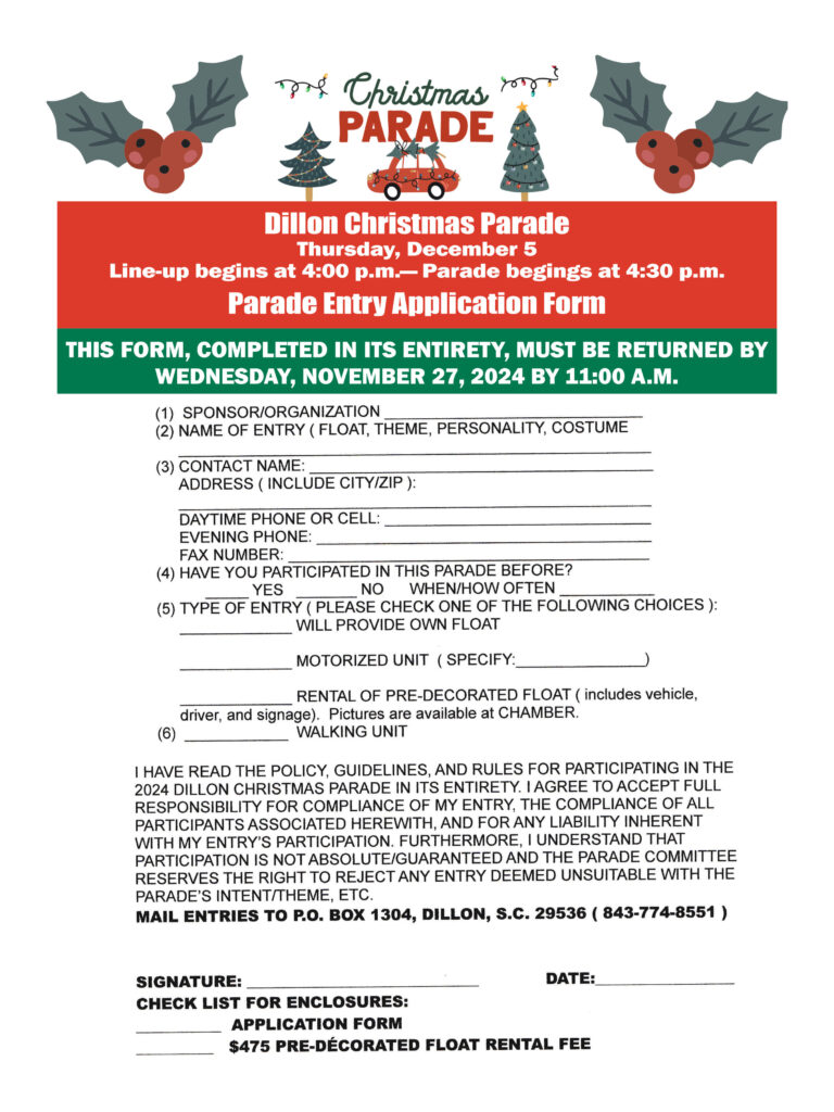 The Annual Christmas Parade will be Saturday, December 7th at 5:30 p.m. Tree Lighting will immediately follow. Deadline for application entry is Wednesday. November 20. 2024. Line-up for the parade will begin at 4:30 p.m. at the Mullins Presbyterian Church located at 809 Sandy Bluff Rd,, Mullins. ENTER AT THE LINK: https://www.cognitoforms.com/CityOfMullinsSC/MullinsHometownHolidaysChristmasParade?fbclid=IwZXh0bgNhZW0CMTAAAR3R4b1CIGDNgxD8TG86X6073Fn36I1SixwwRaM1rju2FoElgnBiUycf0bg_aem_q1UCaIYY7JNRzMSb488gQw