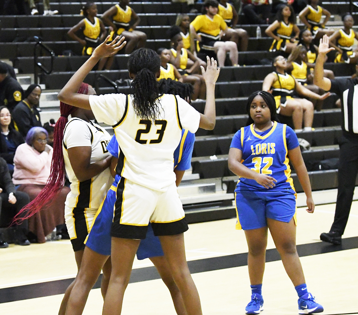 Loris’ Iyonna Waters led the Lady Lions with 9 points. She had two 2-point baskets, a 3-point basket, and 2 free throws. Jamiya McLeod added two 2-point baskets for 4 points. Isis Jackson sank a 2-point basket. Layna Hemingway connected for 2 free throws.