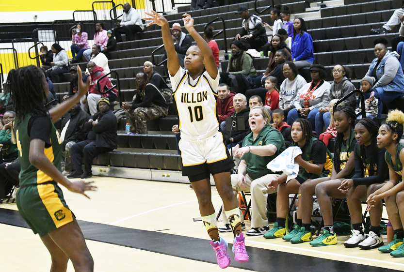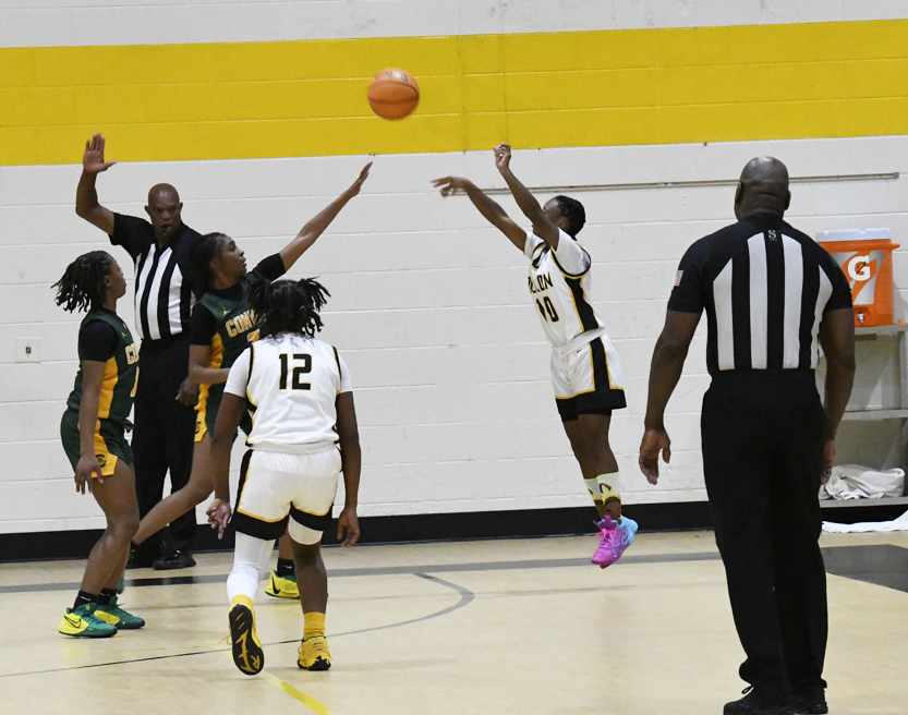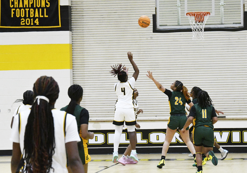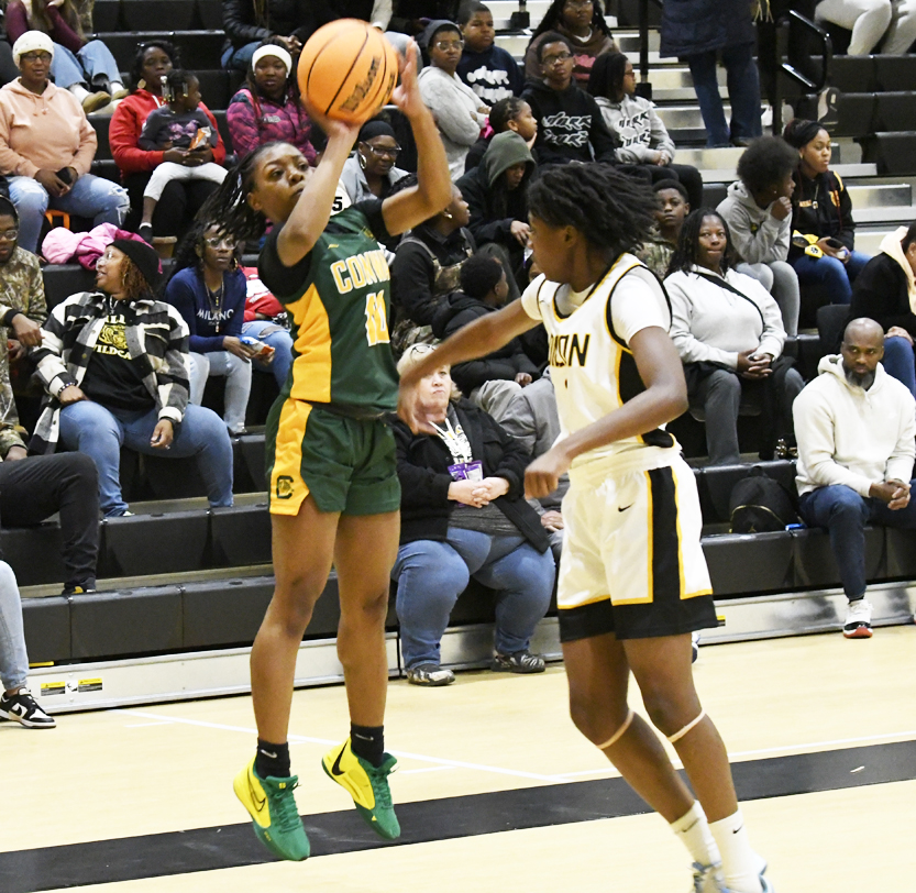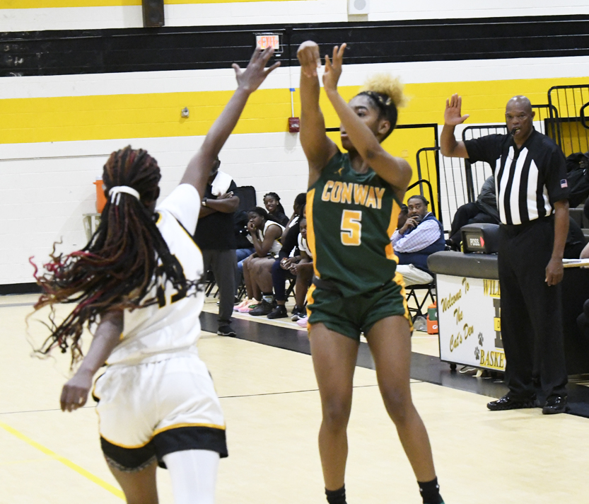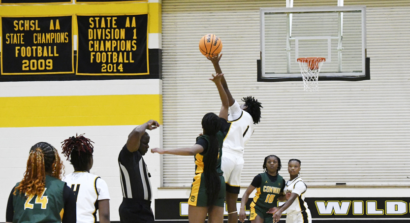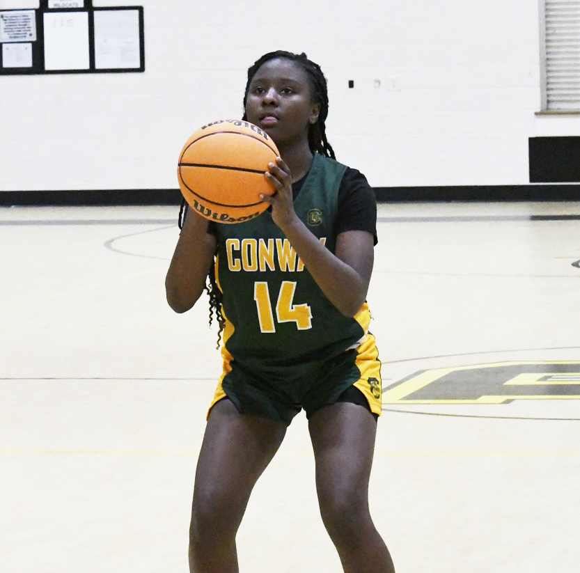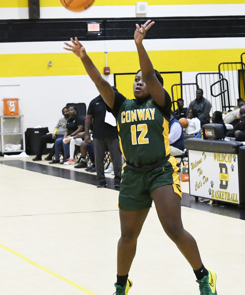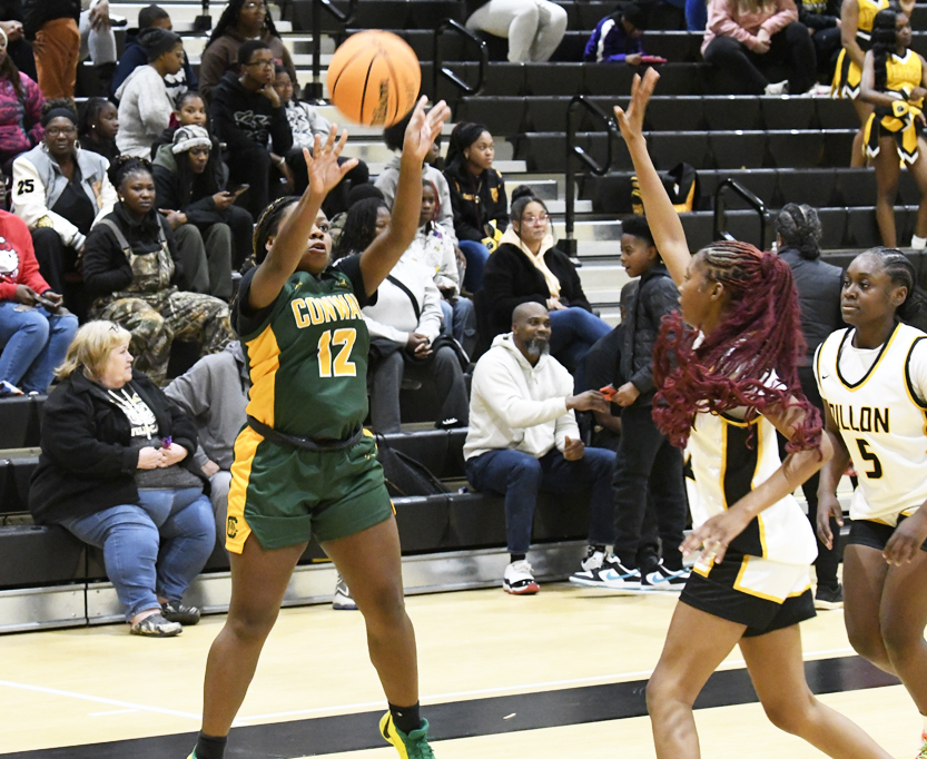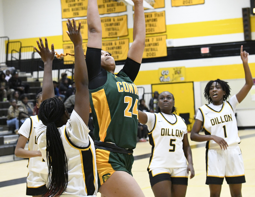 Dillon’s Treasure Davis hit two 2-point baskets to start the scoring. Dillon’s Khwnylahi McKinnon connected for a 2-point basket as did Jiana McGill. Dillon was off to an 8-0 start before Conway got onto the scoreboard with a 2-point basket from Ahchiya Hill.