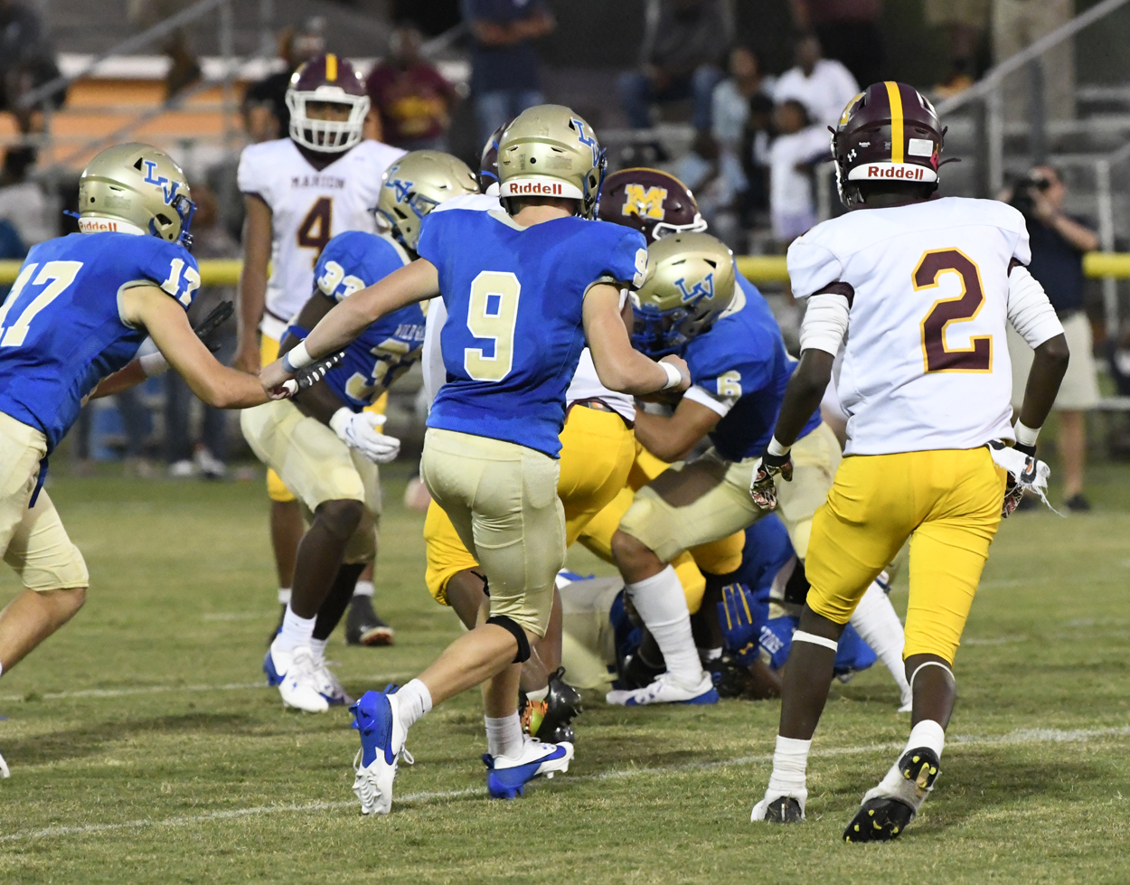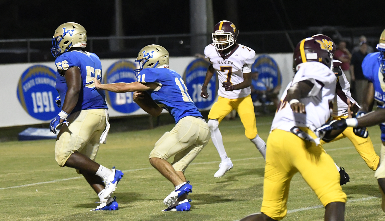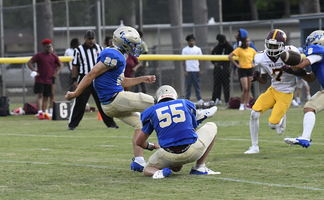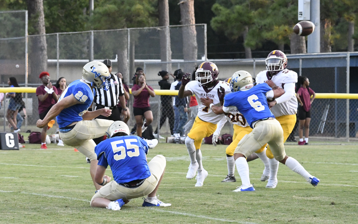 Lake View’s Caden Huggins kicked off for the Wild Gators to begin the season. Marion’s offense could not get moving and was forced to punt.