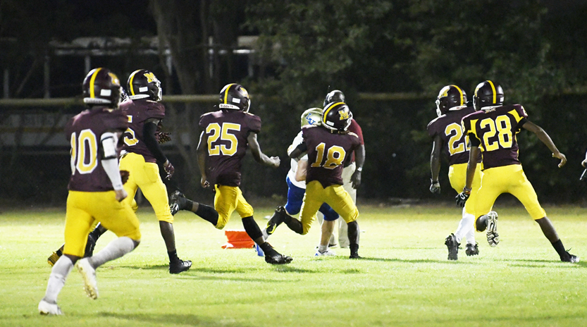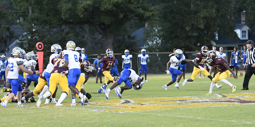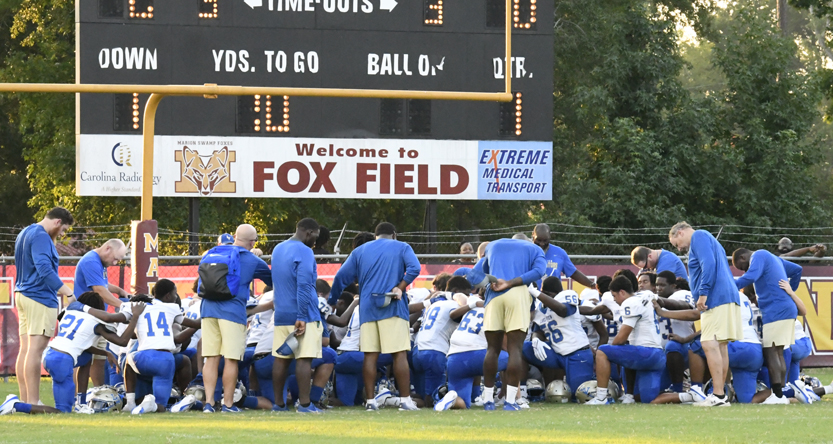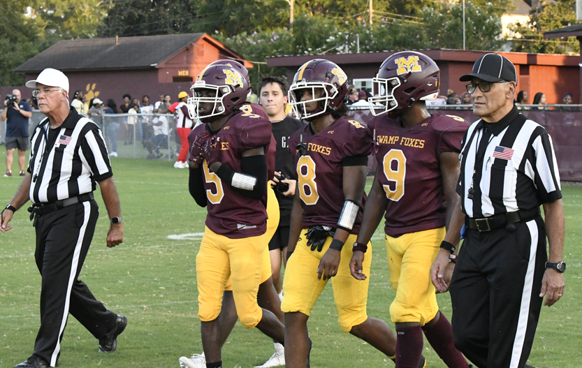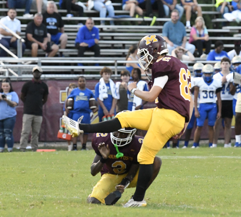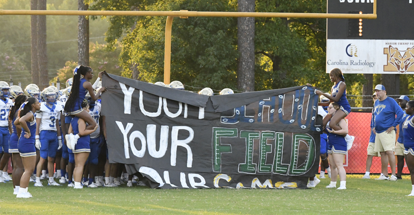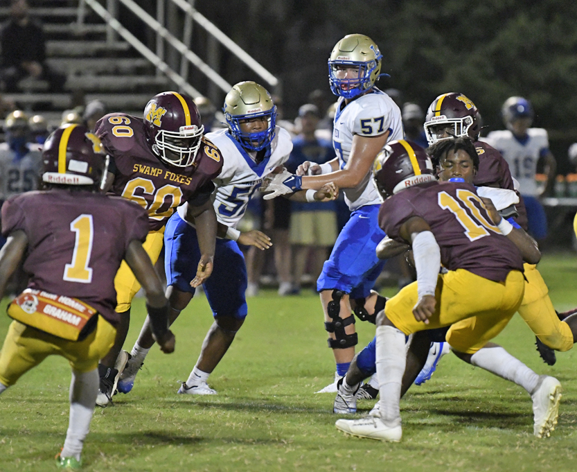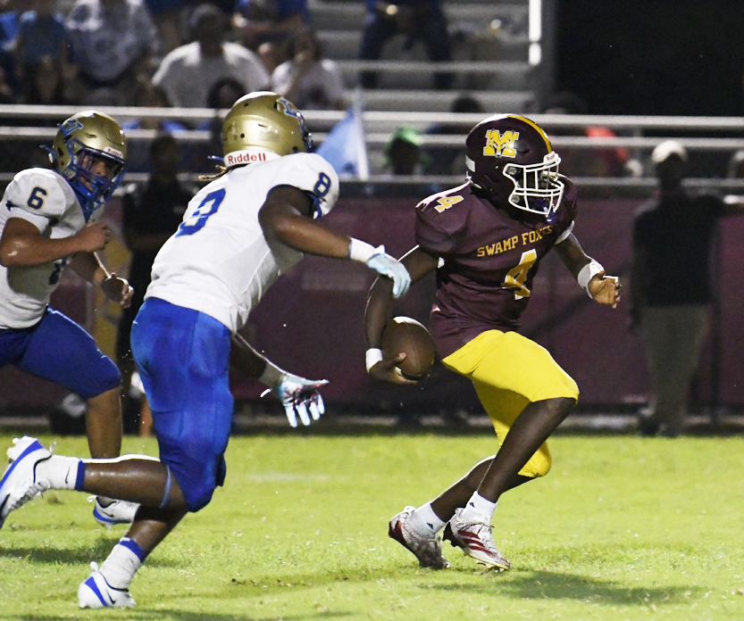 The Swamp Foxes began moving the football and managed to pick up a first down, the first of the season. With 3:17 remaining in the first quarter, Marion’s #8 rushed for a touchdown. The PAT was good by #82. Marion led 7-0.
