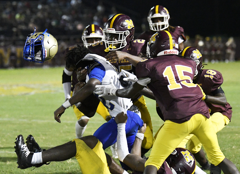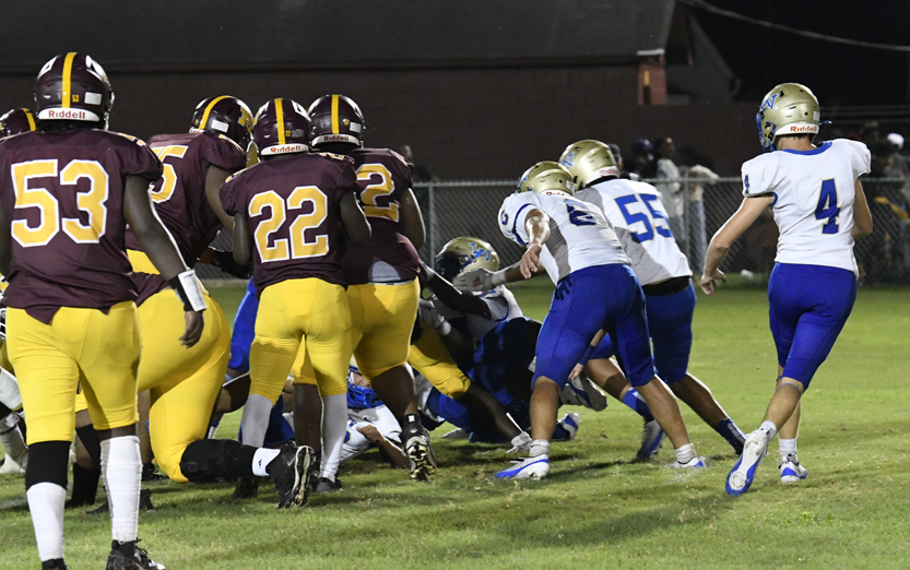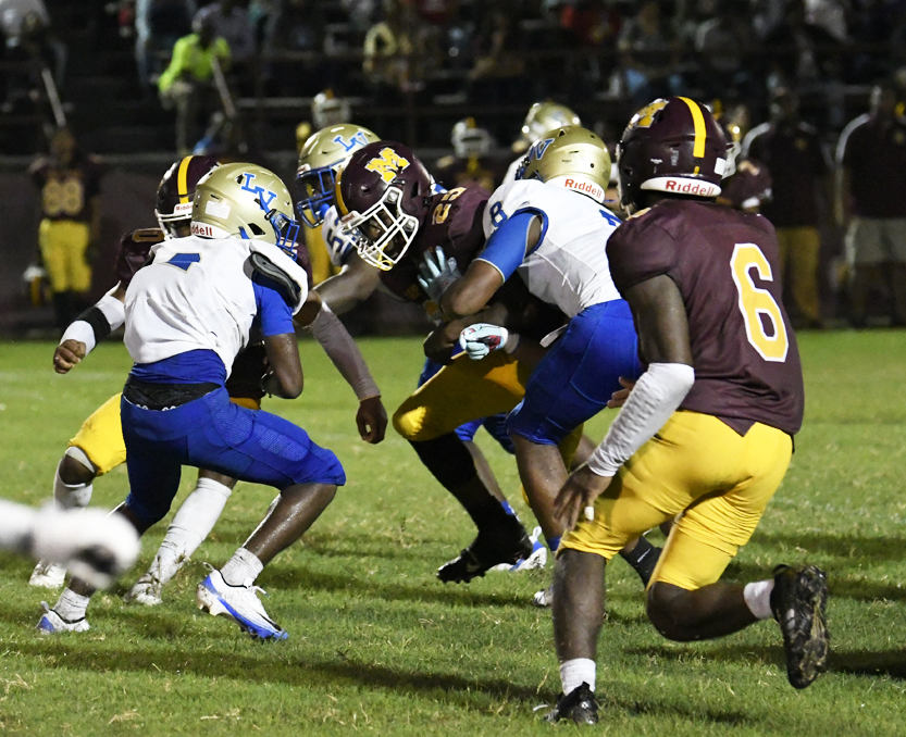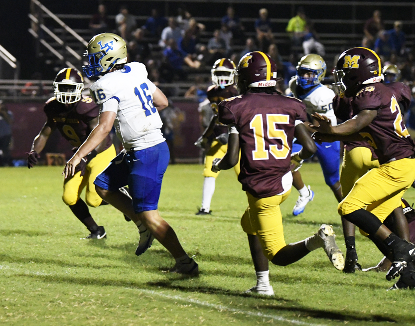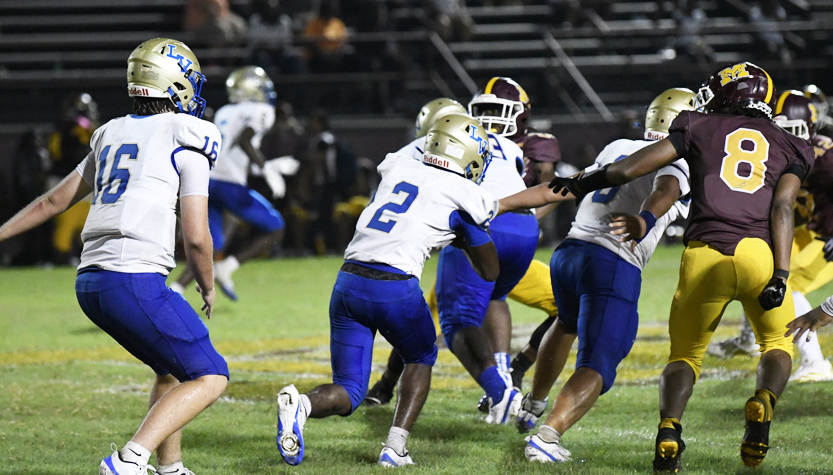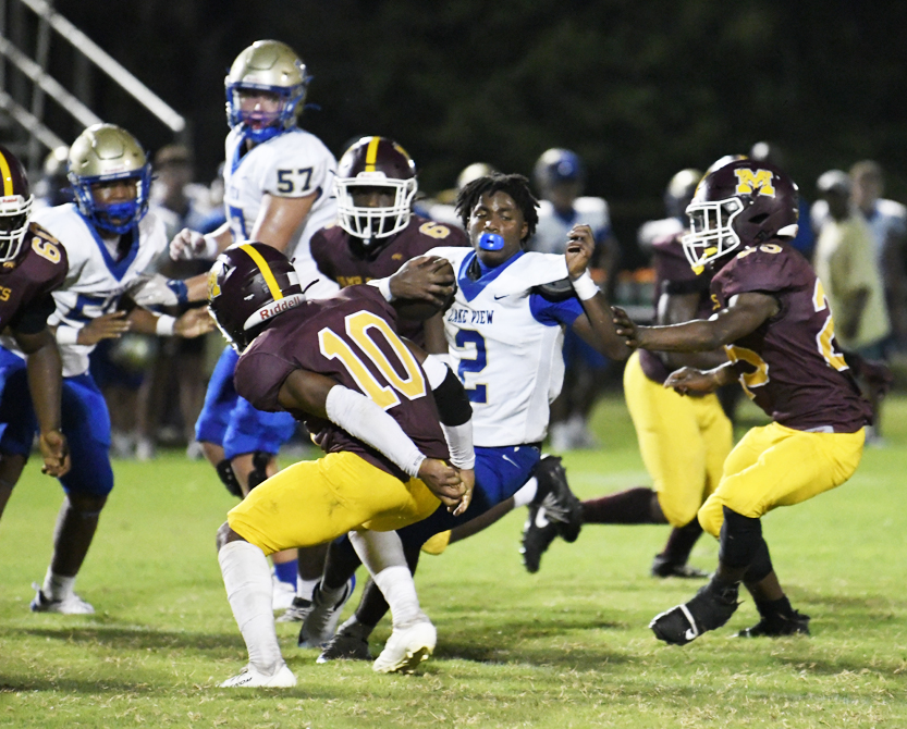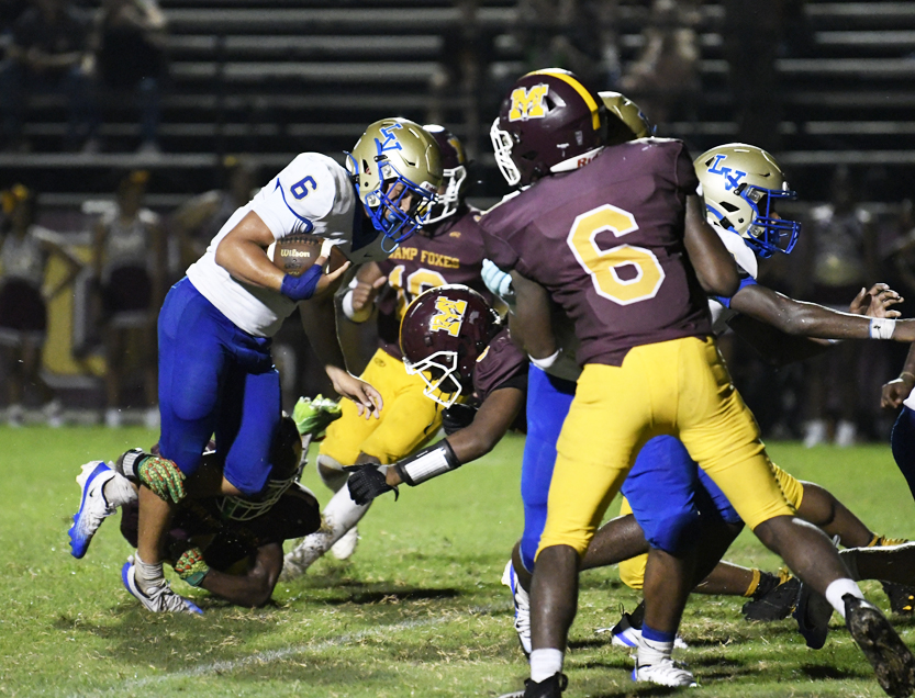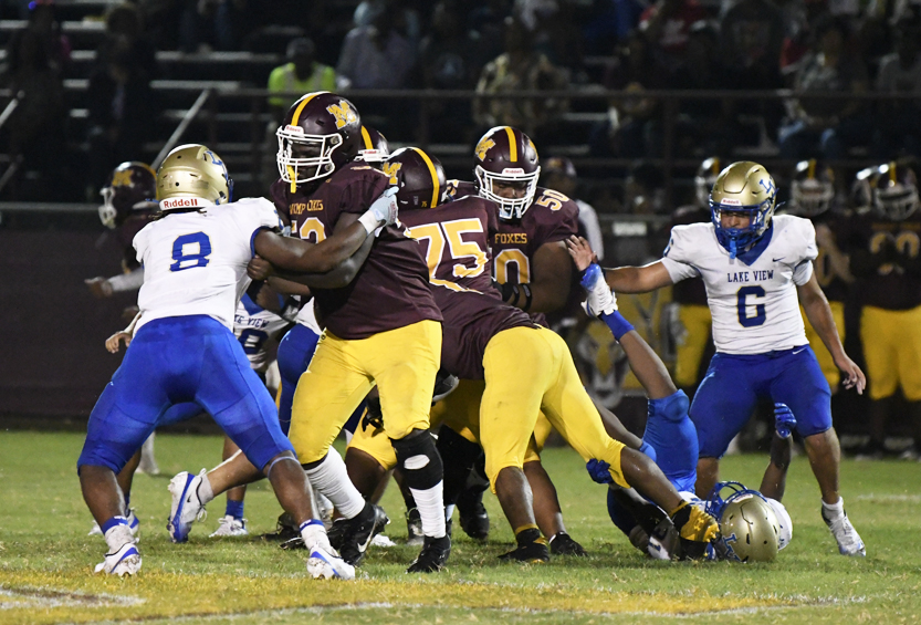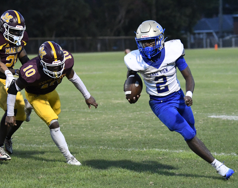 Lake View fumbled the ball on the opening kickoff of the third quarter to give Marion great field position on Lake View’s 10-yard line. After a pickup of 4 yards by Marion’s #4 followed by Marion’s #1 who carried the pigskin to the 1-yard line, the Swamp Foxes’ #8 scored with 10:01 remaining in the third quarter. The 2-point conversion attempt was stopped. Lake View led 14-13.