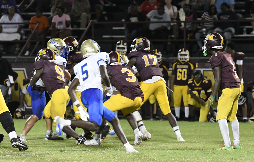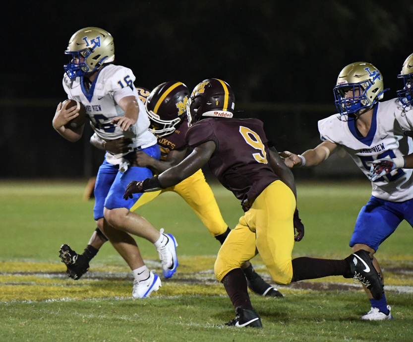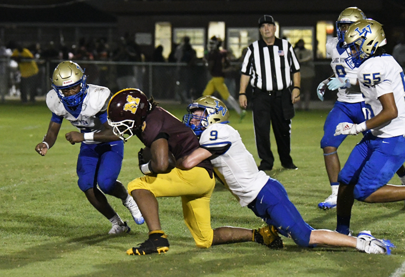 Marion’s #22 intercepted a Lake View pass. After Marion’s #5 was dropped in the backfield for a loss, an intended pass for #7 failed. Marion was forced to punt.
