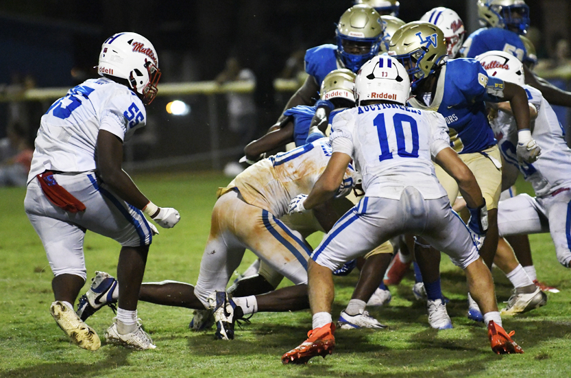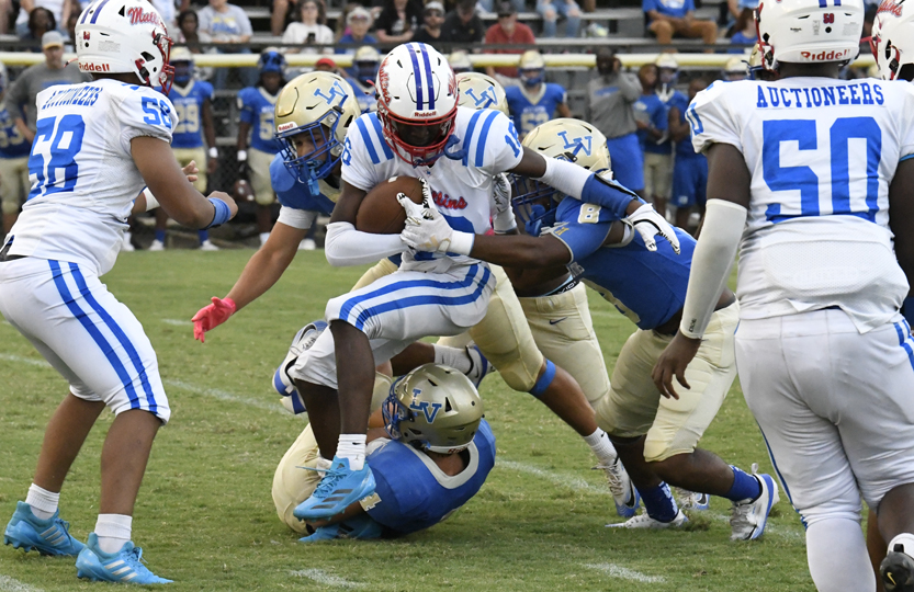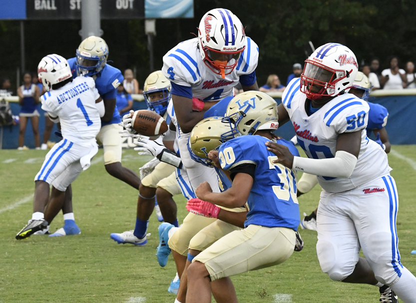 After Mullins received the kickoff, Mullins’ #1 caught a pass and rushed for a first down. A completed pass to the Auctioneers’ #10 was good for a 20-yard gain. Mullins faced a fourth down and 4 and came up short on a carry by #2, Kanazzion Bethea. Lake View took over on their own 40-yard line.
