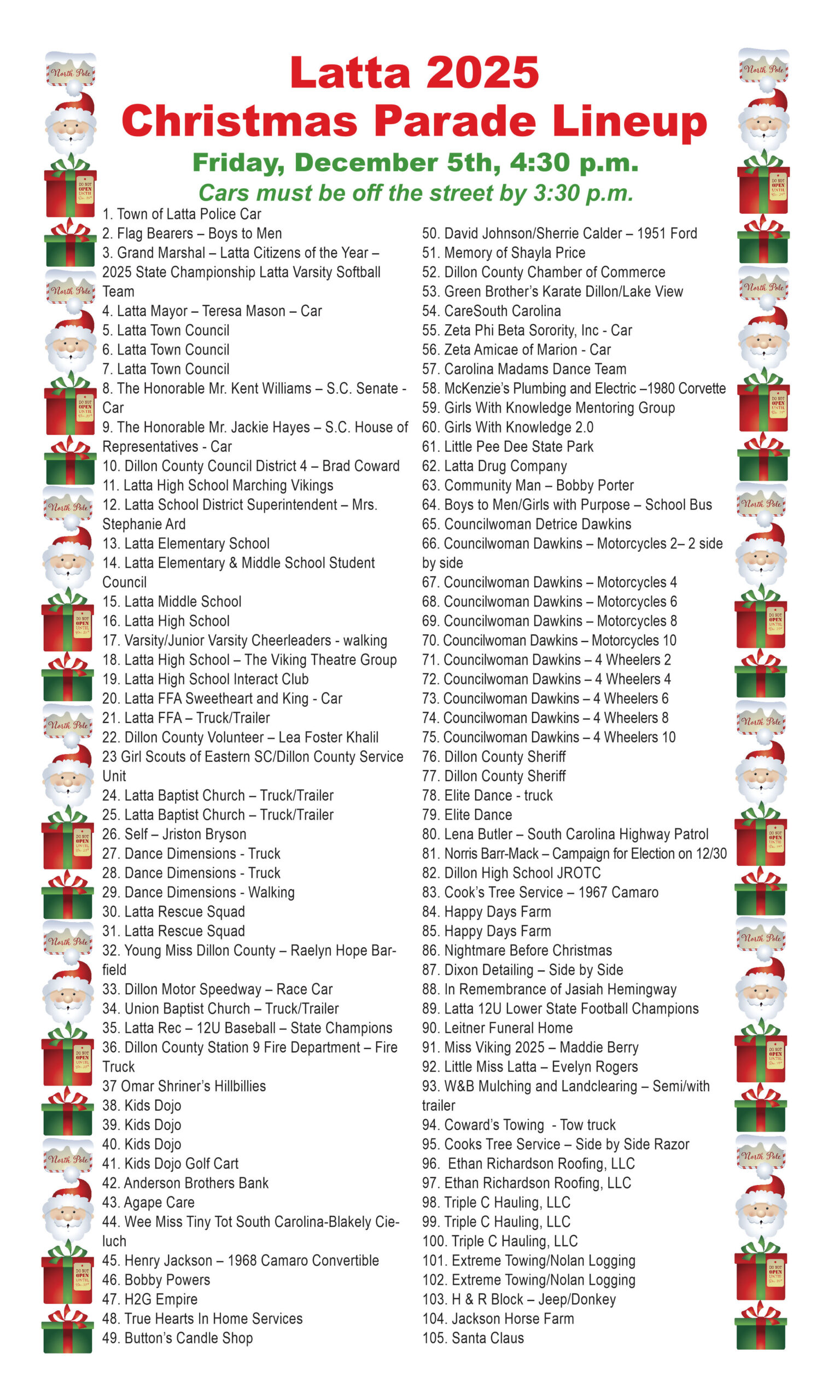 The Latta 2025 Christmas Parade Lineup is Friday, December 5th at 4:30 p.m. Cars must be off the street by 3:30 p.m.