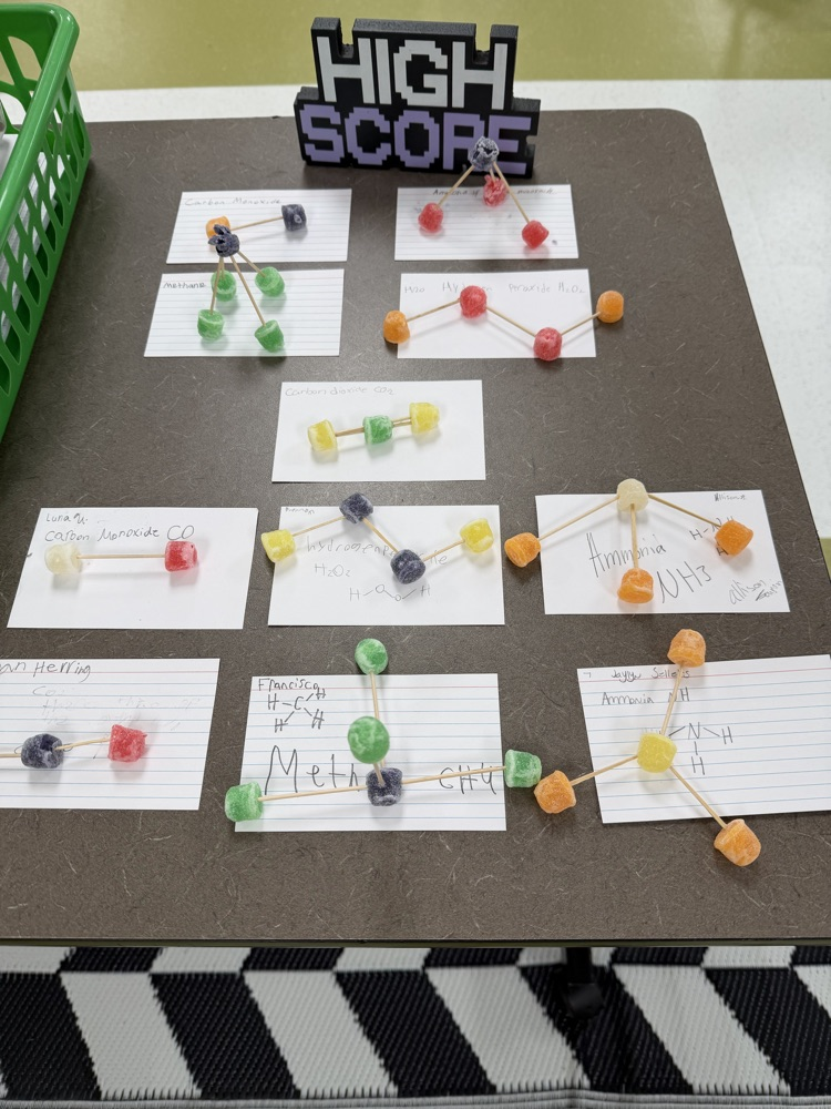 Mrs. Marsh’s 7th grade Science classes at Latta Middle School have been studying atoms, elements, molecules, and compounds. They created 3D models of various molecules called ball and stick models. They used gumdrops to represent the atoms and toothpicks to represent the chemical bonds. Models were made for hydrogen peroxide, carbon dioxide, methane, ammonia, and carbon monoxide.