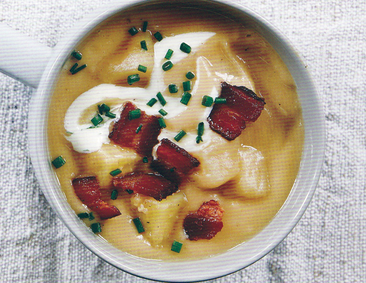 Ladle the soup into bowls and top with the reserved bacon, chives, and dollop of sour cream. Serve immediately.