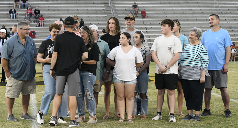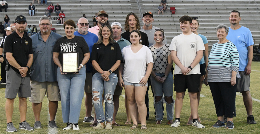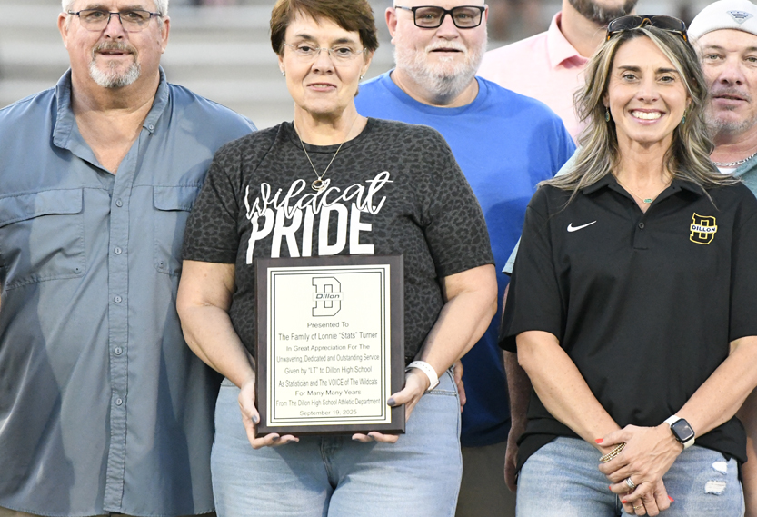 The plaque stated: “Presented to the Family of Lonnie “Stats” Turner in Great Appreciation for the Unwavering Dedicated and Outstanding Service Given By “LT” To Dillon High School As Statistician and The VOICE of The Wildcats For Many, Many Years. From The Dillon High Athletic Department September 19, 2025″