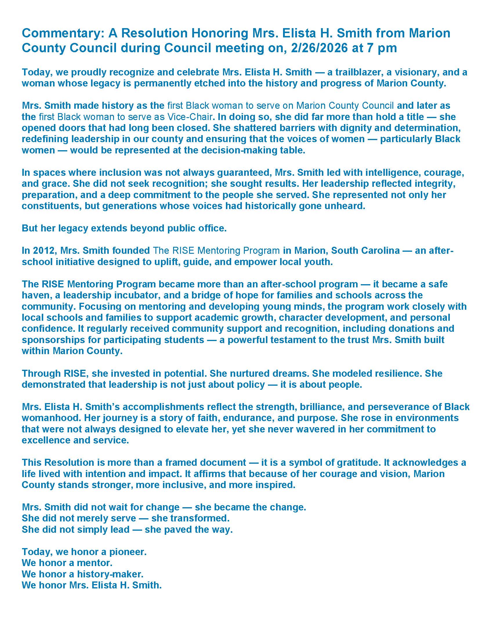 Mrs. Smith’s leadership, vision, and dedication continue to impact Marion County, and Council was honored to formally recognize her legacy.