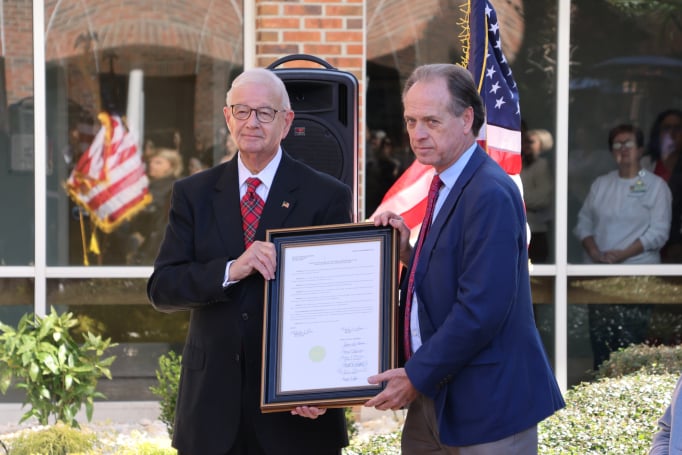Caption: Loris City Mayor Mike Suggs presents a proclamation to commemorate the 75th anniversary to Ronald Fowler, McLeod Health Chairman of the Board, and CEO Scott Montgomery.