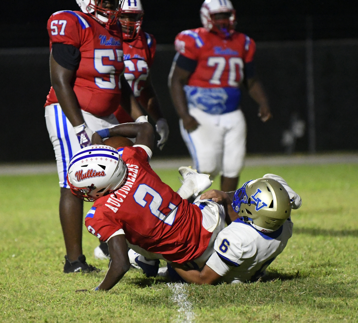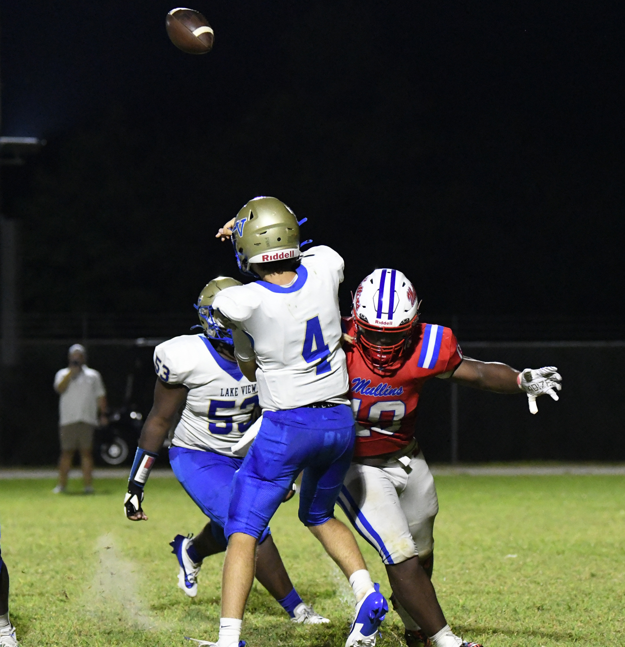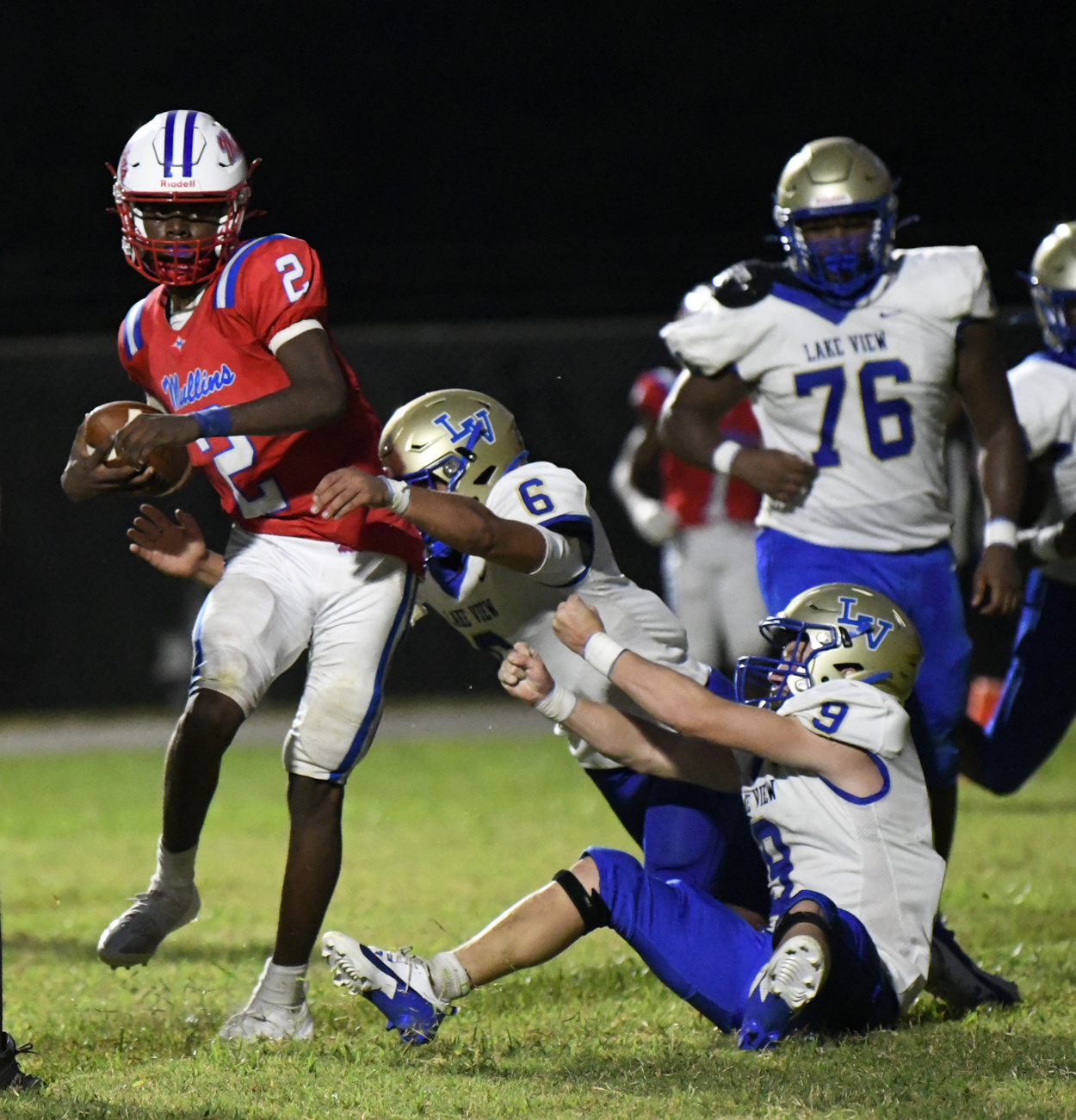Mullins’ Zayan Grant scored from 17 yards. However, a flag on the play nullified the touchdown. Mullins’ Kanazzion Bethea carried and a flag against Lake View gave Mullins a first down on Lake View’s 11-yard line. On fourth and 3, Mullins’ Kanazzion Bethea fumbled, and Lake View recovered the fumble on their 10-yard line. On fourth and 1, Lake View was stopped and Mullins took over on Lake View’s 18-yard line.