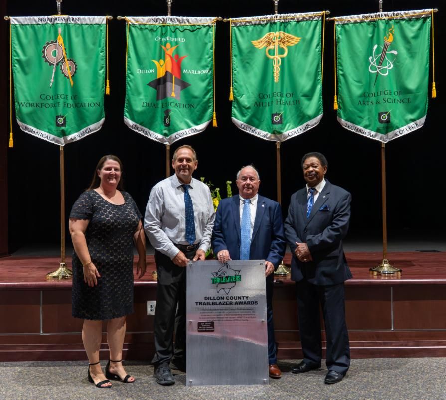 Retired Chairman of the NETC Board of Area Commissioners, Dan Bozard, was recognized and presented with the Dillon County Trailblazer Award during the college’s summer commencement ceremony in appreciation of his years of service and leadership to the college, having served as Chairman from August 2016 through February 2025. Shown in photo (L to R): NETC Vice President Erin Fann, NETC President Dr. Kyle Wagner, Retired Area Commission Board Chair Dan Bozard, and Area Commission Board Chair Herbert Gould.