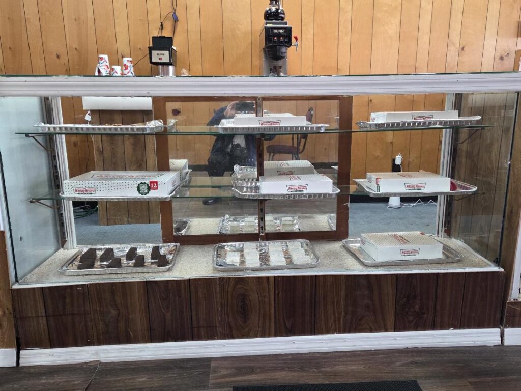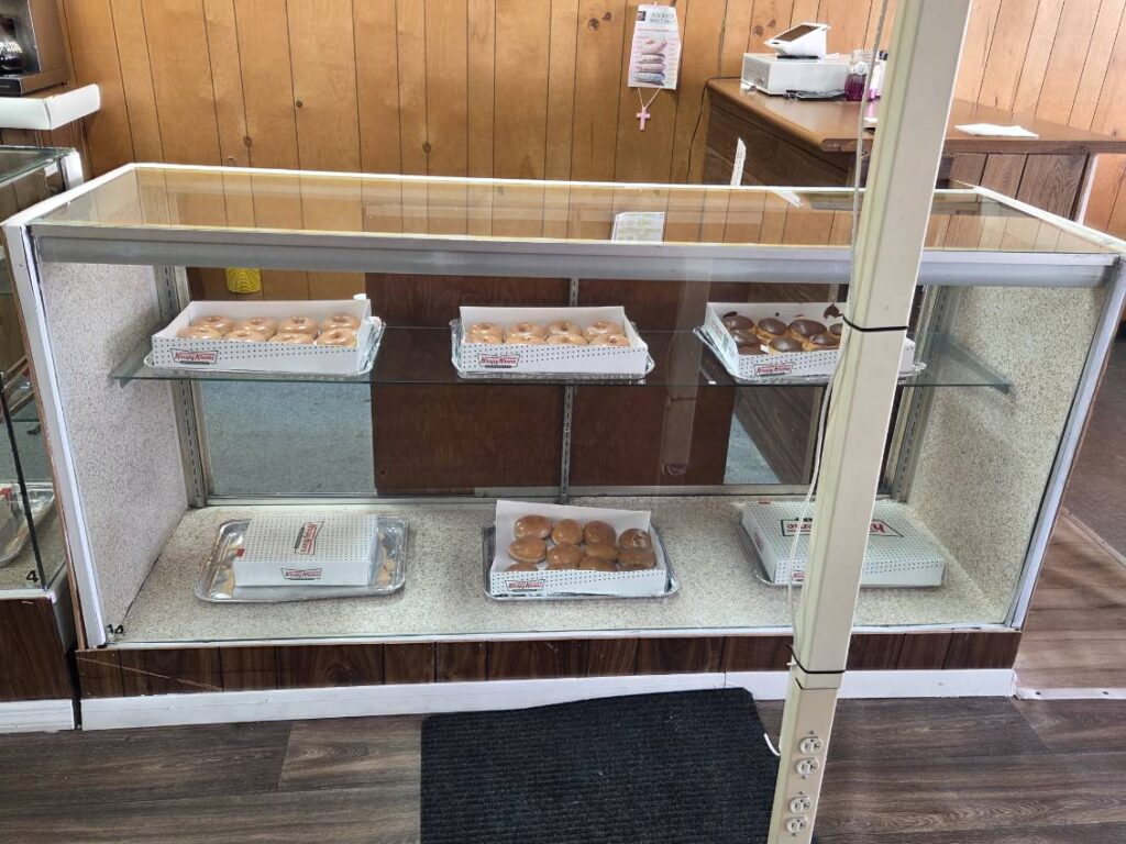 The shop offers different types of Krispy Kreme donuts, pizza, hot dogs, homemade chili, and coffee.