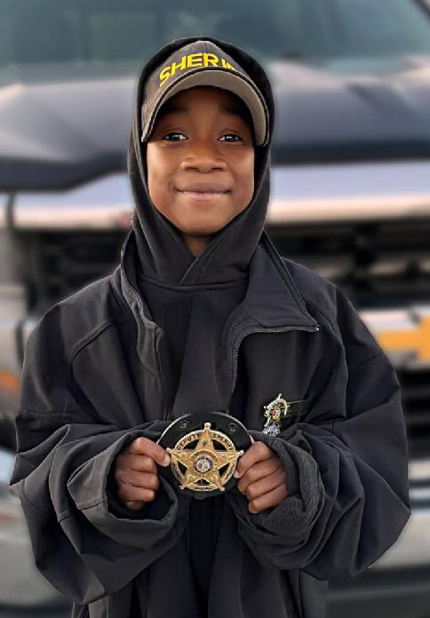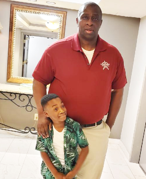 Pictured at top are Bryan and DJ Pernell making the delivery; and below, DJ Pernell with his grandfather’s badge, the late Sheriff Douglas Pernell, and Douglas Pernell and DJ shortly before Douglas’ passing.
