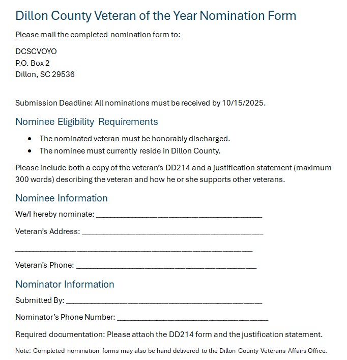 It’s time to make your nominations for Dillon County Veteran of the Year! Selection is made from nominations submitted and by past veterans of the year. The selected 2025 Veteran of the year will be announced on Veterans Day at the Veterans Square patriotic program. Considerable consideration is given to the efforts the nominee puts into helping veterans and veteran causes.