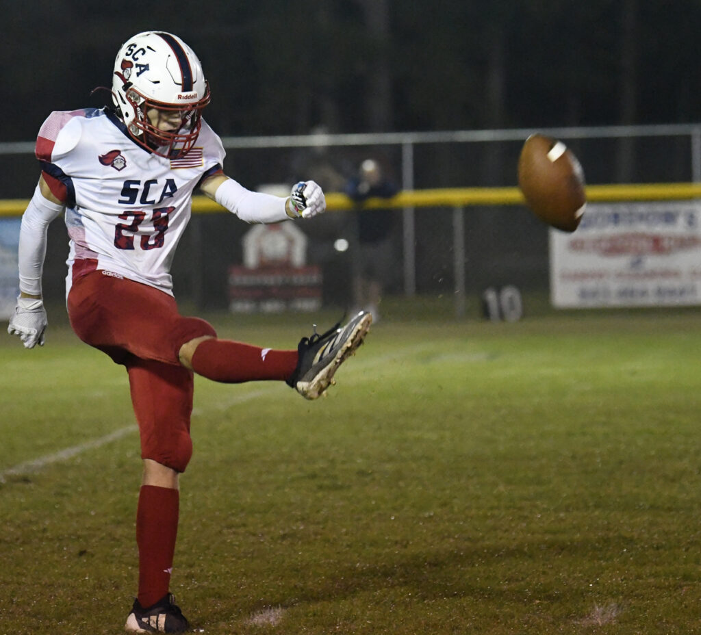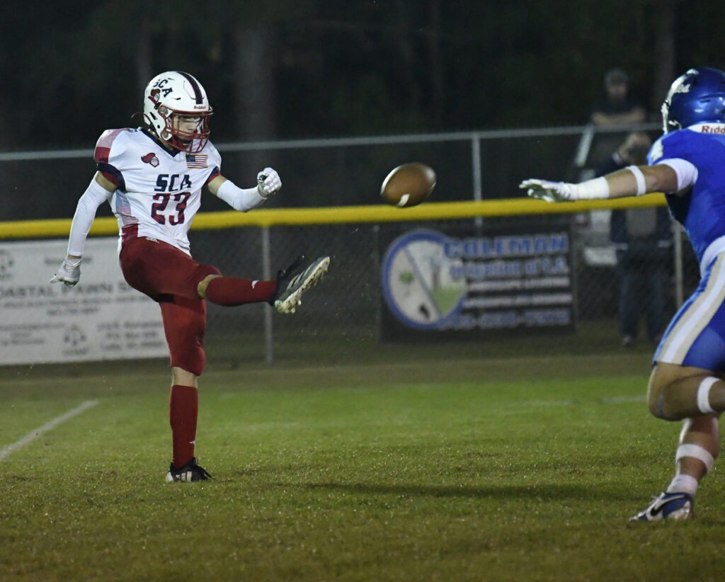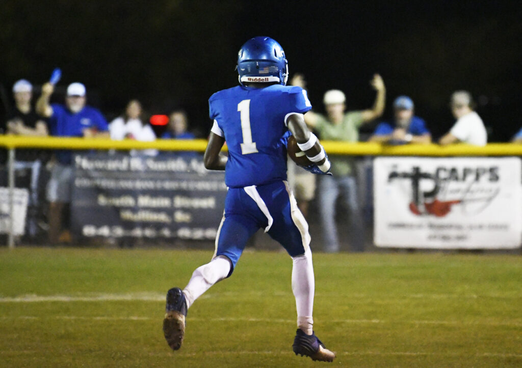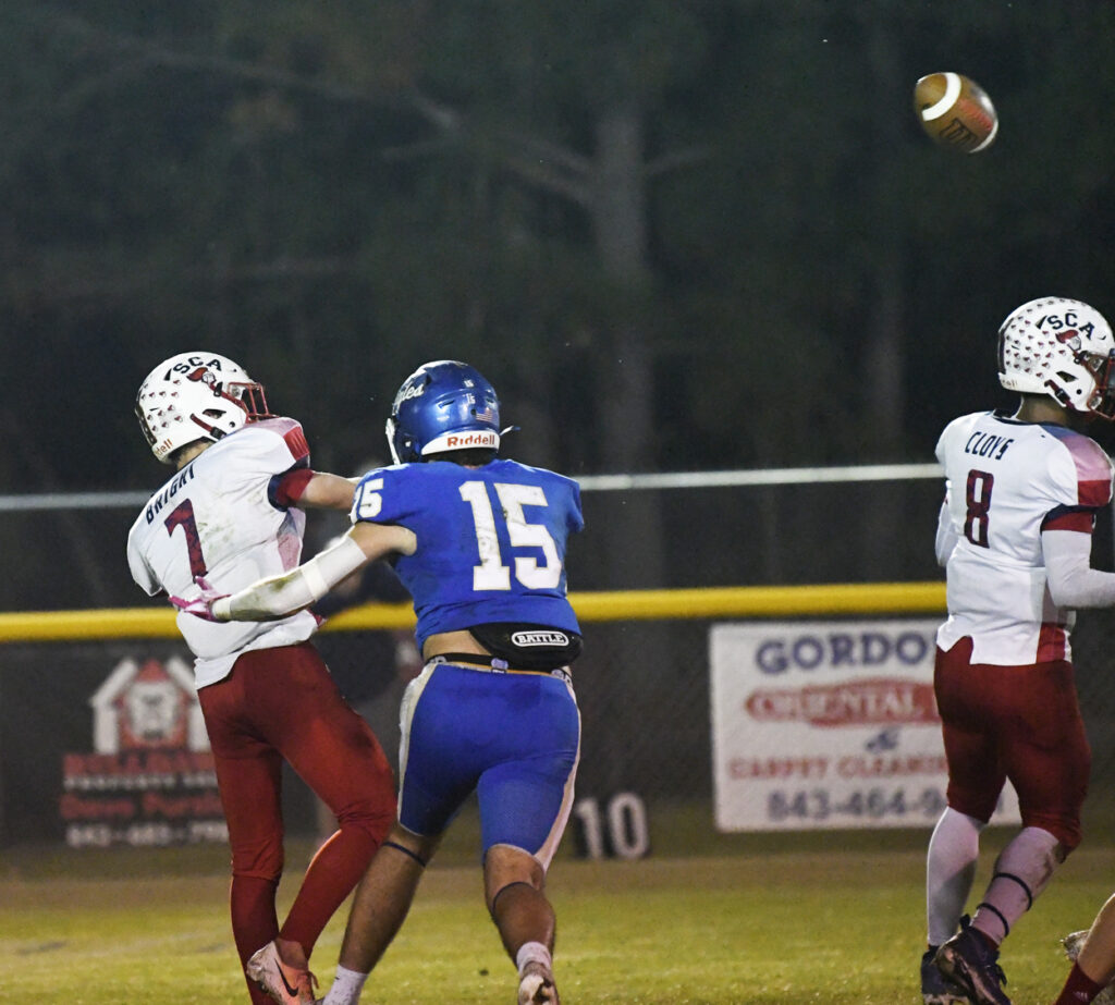 With 1:05 remaining in the first half, Pee Dee Academy’s O’maury Mckelvey returned the kickoff for a touchdown. The PAT attempt by Noah Poston was no good.