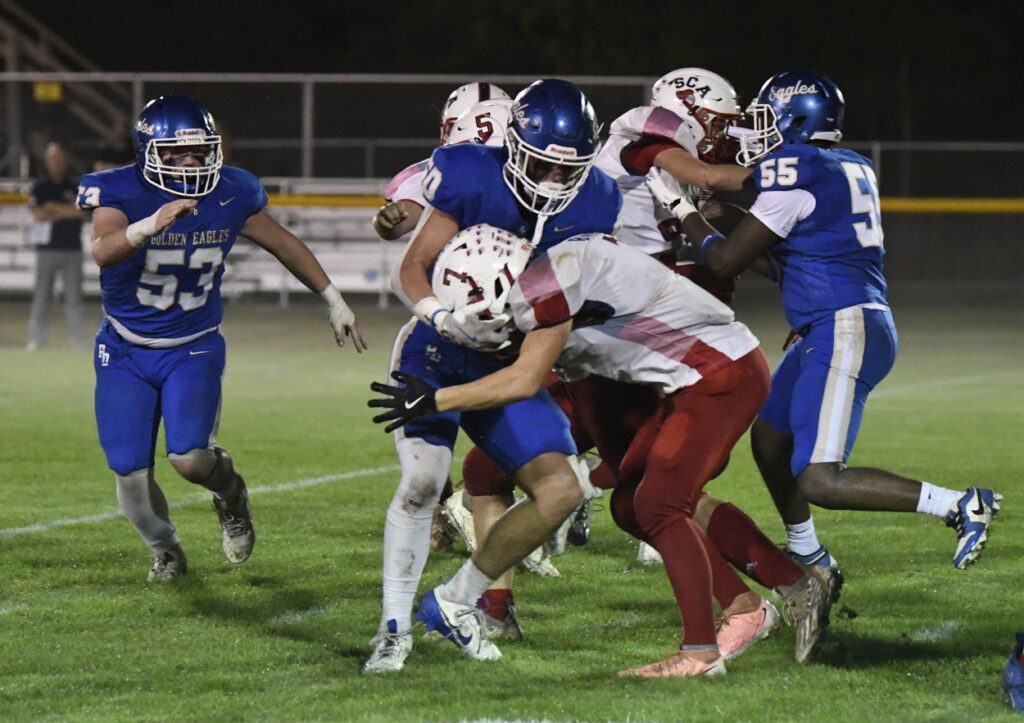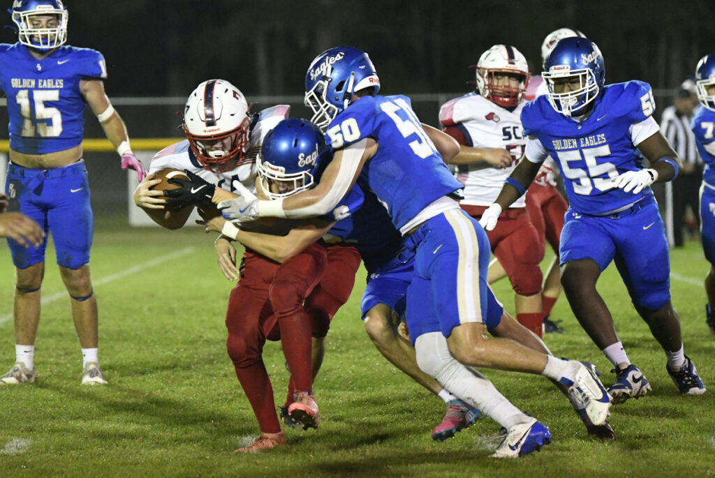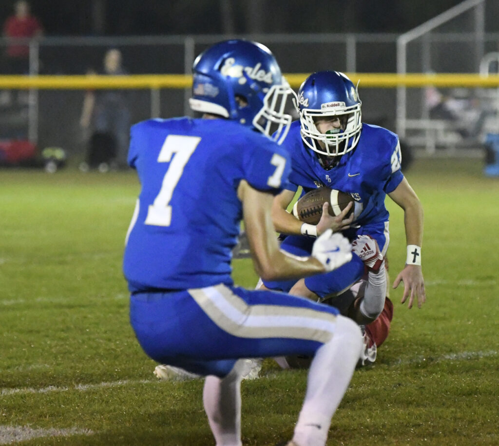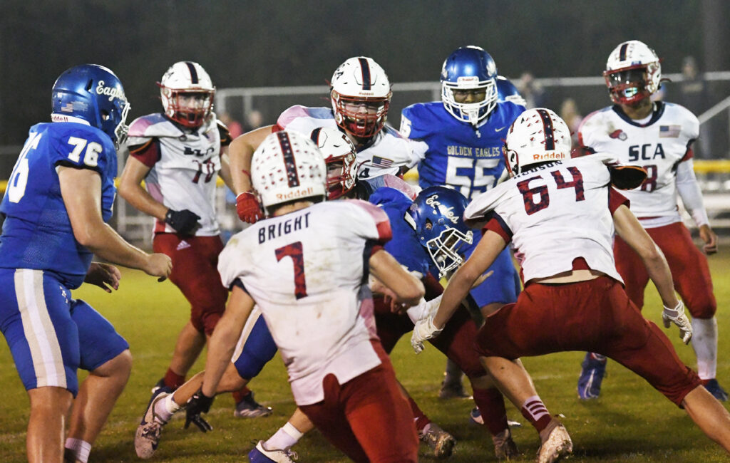 With 10:39 remaining in the first half, Ryan Small scampered for a 29-yard touchdown. After a bad snap, Pee Dee Academy’s Noah Poston rushed for the 2-point conversion to give the Golden Eagles a 36-0 lead.