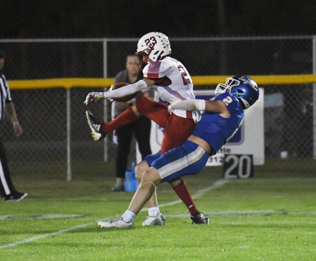 The Golden Eagles’ Miles Trussell make a good catch for a first down that led to O’maury Mdkelvey scoring a 35-yard touchdown after the reception with 4:37 remaining in the first quarter. Miles Trussell’s PAT was good. Pee Dee Academy was up 28-0.
