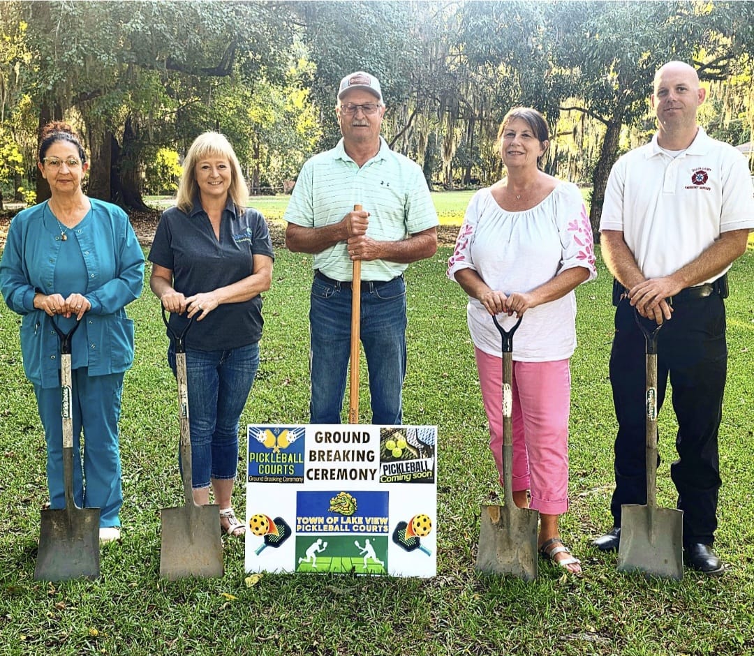 Town of Lake View Mayor David Suggs & Councilmembers Paula King, Mitsey Church, Tracy Townsend & Ryan Price gather at the Mill Pond for the Lake View Pickleball Courts Groundbreaking Ceremony.