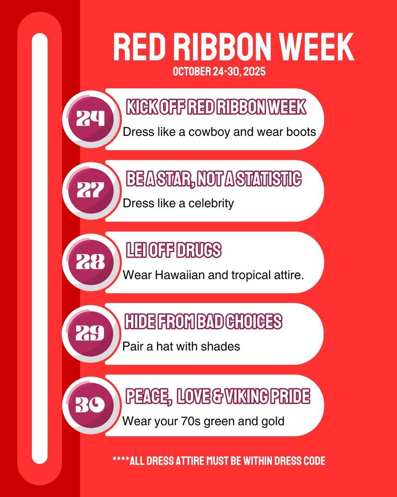 Red Ribbon Week is a national campaign that inspires students to live drug-free lives and make positive choices for their futures. At LMS, we’re celebrating with fun spirit days to show our commitment to a healthy lifestyle and Viking pride!
