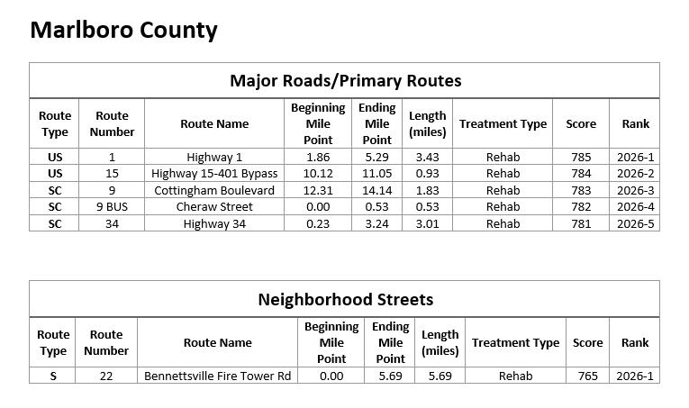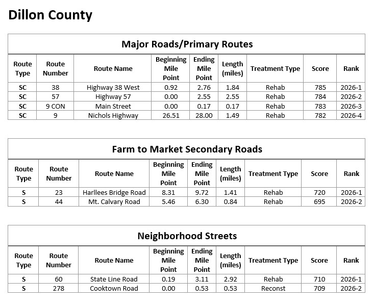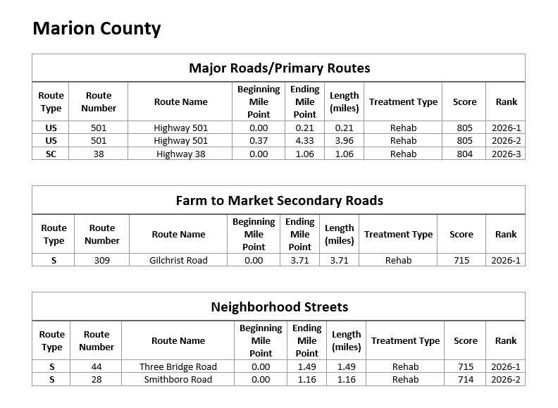 View the current list of roads included in the 2026 Pavement Improvement Program: 2026 Pavement Improvement Program (scdot.org) at https://storymaps.arcgis.com/stories/50055ca39899437e89e979dc04bafa82.