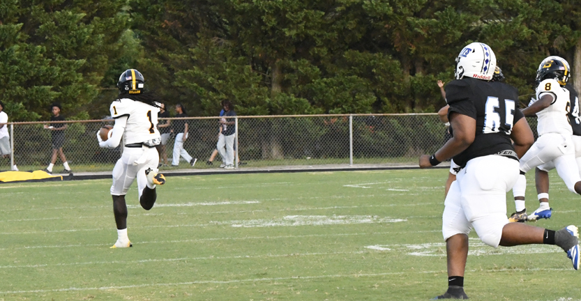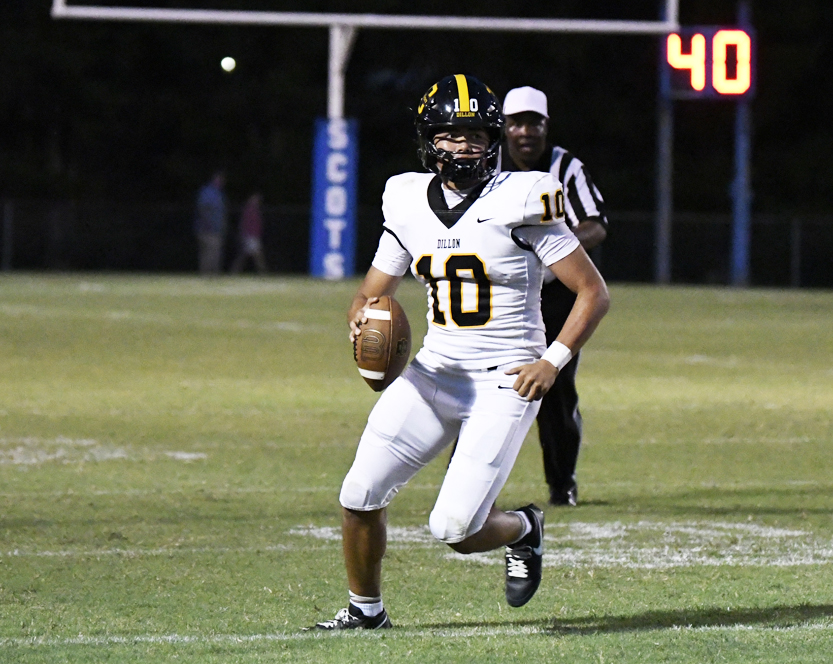 Dillon’s Zay Robertson returned the kickoff to Dillon’s 40-yard line. The Wildcats’ quarterback picked up 6 yards followed by #8, Dominick Felton who picked up a first down but a flag was thrown against Dillon. Dillon’s #42 caught a pass and moved the football into Scotland County’s territory on the 49-yard line. Dillon’s #7, Daniel Capehart, scored a 4-yard touchdown with 8:58 remaining in the second quarter. The PAT was good by #84. Dillon led 20-14.