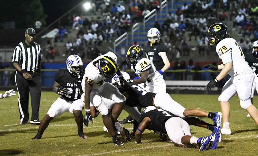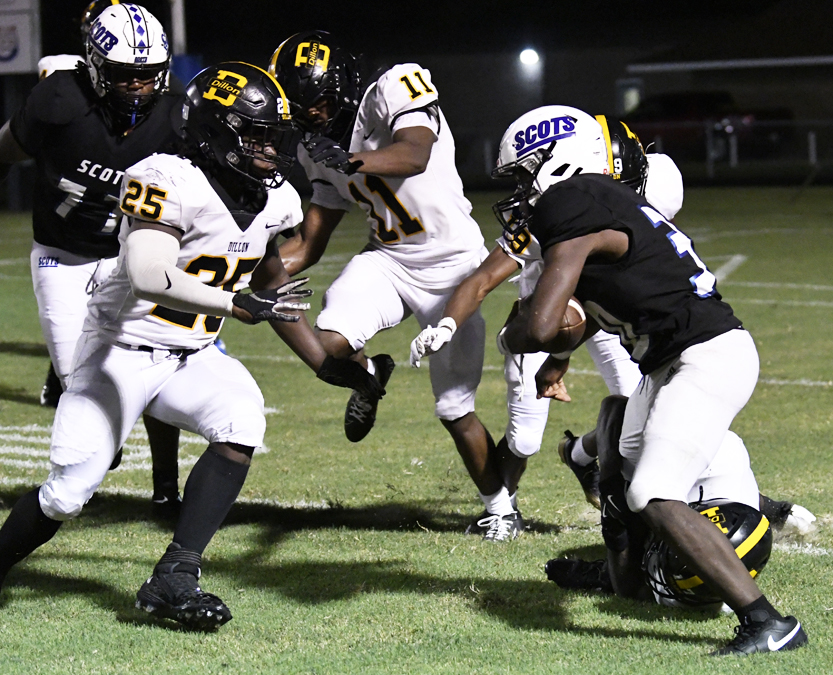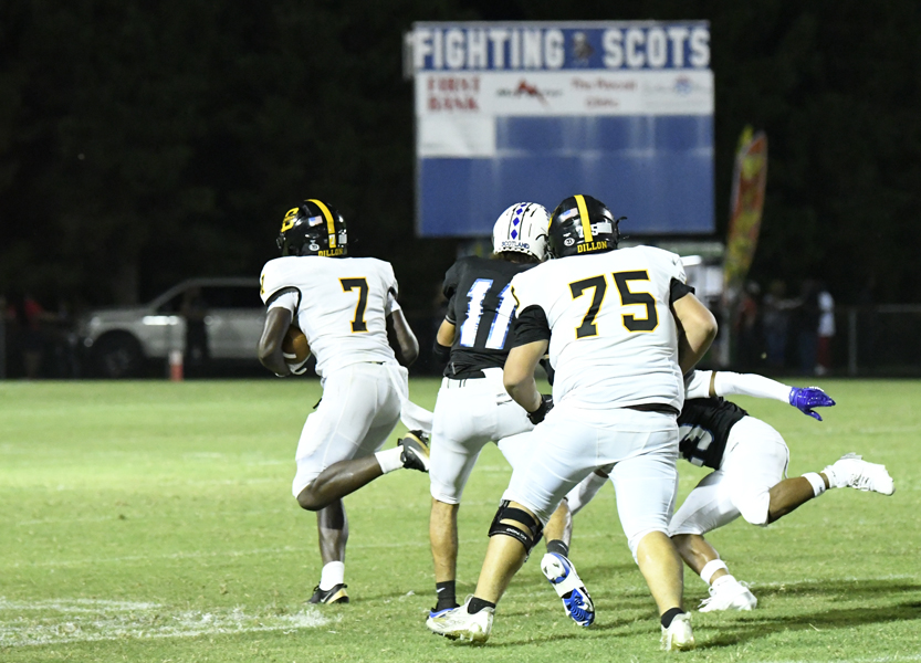 Dillon’s offense could not move the football, and JJ Campbell was forced to punt. Scotland County’s #32 returned the punt to Dillon’s 29-yard line. On fourth and 8 to go, Scotland County’s #7 punted. Dillon returned the punt to Dillon’s own 43-yard line. Dillon’s quarterback quick punted on fourth down and 2 yards to go to Scotland County’s 5-yard line. The Flying Scots began to move the football. An interception by Dillon’s #19 stopped the momentum as he returned the football to Scotland County’s 46-yard line. Dillon faced a fourth down and 13. Once again, Dillon’s quarterback quick punted to Scotland County’s 7-yard line. Scotland County’s #30 carried the football to the 44-yard line. Dillon was called for pass interference on a pass intended for #6 that moved the football to Scotland County’s 26-yard line with an automatic first down. On Dillon’s 49-yard line, Scotland County was forced to punt on fourth down and 11 yards to go. The punt placed the football on Dillon’s 32-yard line. Faced with a third down and 1 yard to go, Dillon’s #7, Daniel Capehart, rushed for a touchdown with 7:02 remaining in the game. The PAT was no good. Dillon led 33-21.