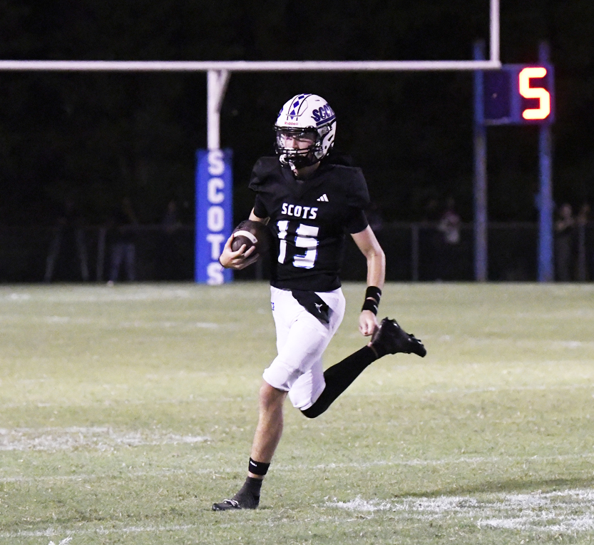 The Fighting Scots faced a fourth down and 1 yard to go when Scotland County’s #30 picked up a first down. The Scots quickly reeled off two more first downs prior to 3 going into the end zone with a 3-yard touchdown. The PAT was good by #84. Scotland County led 7-6 with 3:49 remaining in the first quarter.