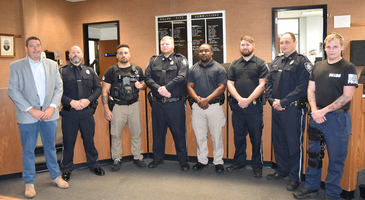 Seven City of Dillon Police Officers were sworn in this morning, Wednesday, August 13th, at the Dillon City Courtroom by Judge Alan Berry. Pictured are City of Dillon Police Chief David Lane, LCpl. Matthew Townsend, PFC Sean O’Neill, Pvt. Johnny Bruce, Pvt. Sequan Jones, PFC Kristian Rogers, Pvt. Leighton Worth, and PFC Dalamarius Coon. (Photos by Johnnie Daniels/The Dillon County News, LLC)