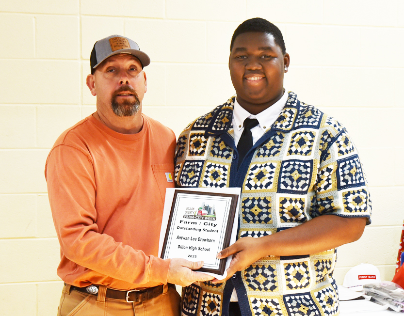 The Farm-City Week Outstanding Student for Dillon High School is Antwan Lee Drawhorn. Antwan is an energetic and enthusiastic young man who has proven how determined and serious he is in achieving his goals by his high academic achievements. He has not only taken the more rigorous courses at Dillon High School, but he has taken many dual credit courses with Northeastern Technical College.