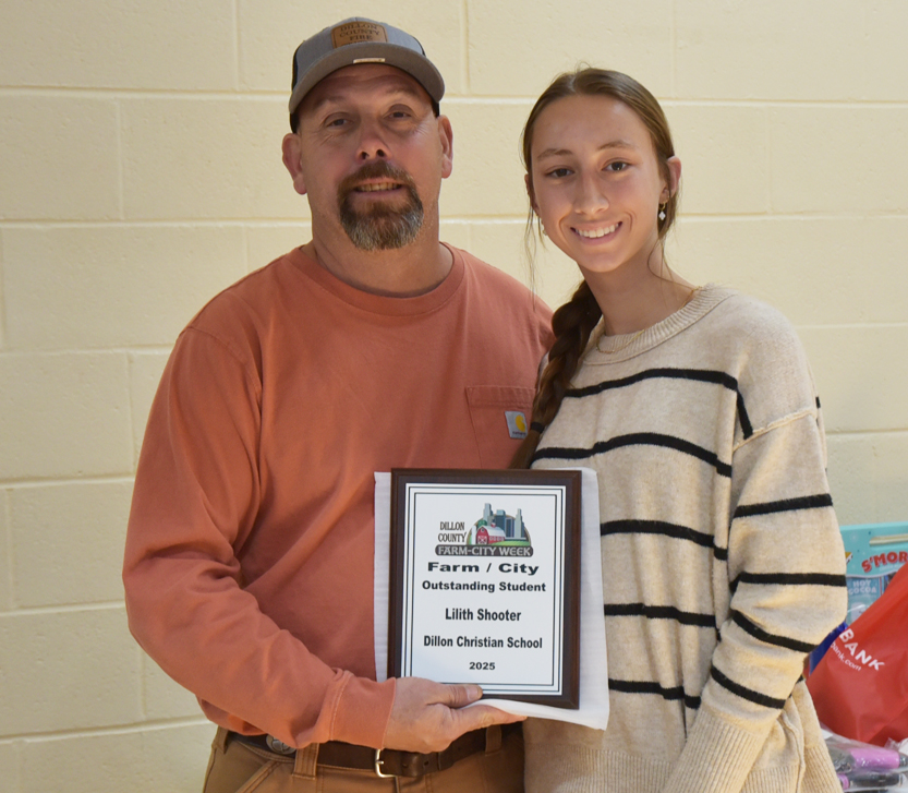 Lillith Shooter, a senior at Dillon Christian School, is the daughter of Charlie and Luanna Shooter of Rowland, North Carolina and the granddaughter of Charles and Cathy Shooter also of Rowland, North Carolina. Wilton Shooter & Sons Farms is a family-owned agricultural business in Rowland, NC, that specializes in growing a variety of crops. The farm is committed to providing fresh, high-quality produce using sustainable practices to benefit the local community and the environment. Coming from a proud farming family who cultivates strong family roots as well as corn, soybeans, and wheat, Lillith exemplifies the values of hard work and dedication both in and out of the classroom. She has been selected to represent DCS as the recipient of the Dillon Farm-City Week Outstanding Student Award for 2025. Lillith has taken dual credit classes during her junior and senior years, demonstrating her commitment to academic excellence and her drive to challenge herself. After graduation, Lillith plans to attend Barton College, where she will continue her educational journey and pursue her passion for softball.