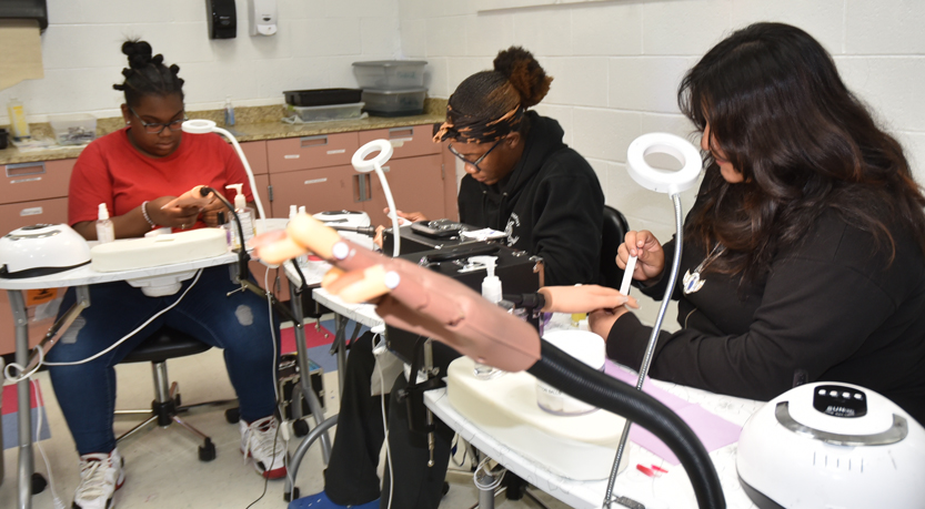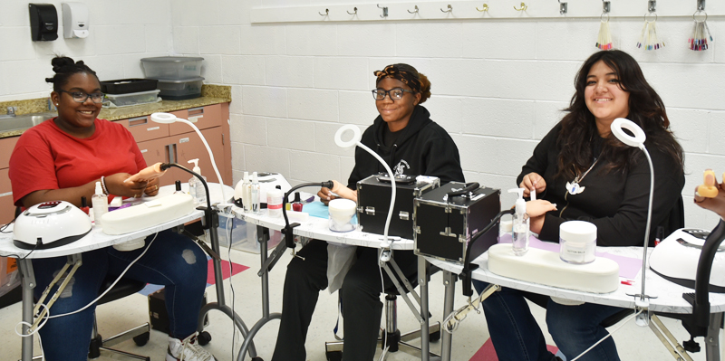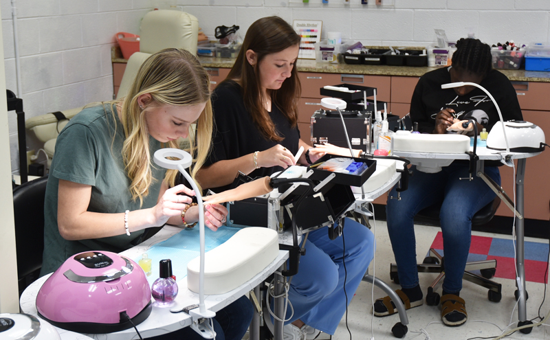 Nail Technology 1, 2, 3, and 4 for grade levels 11 and 12. is taught by Tabatha Bowen. The courses must be taken sequentially. One must pass Nail Technology 1 with a minimum of a 75 average and a minimum of 120 hours before taking Nail Technology 2. One must pass Nail Technology 2 with a minimum of a 75 average and a minimum of 240 clock hours before taking Nail Technology 3, and one must pass Nail Technology 3 with a minimum of a 75 average and a minimum of 360 hours before taking Nail Technology 4 (optional). Completer requirements: (300 hours Nail Technology and 60 hours S.C. Department of Education and a minimum 3 courses and 3 units to be a completer.)