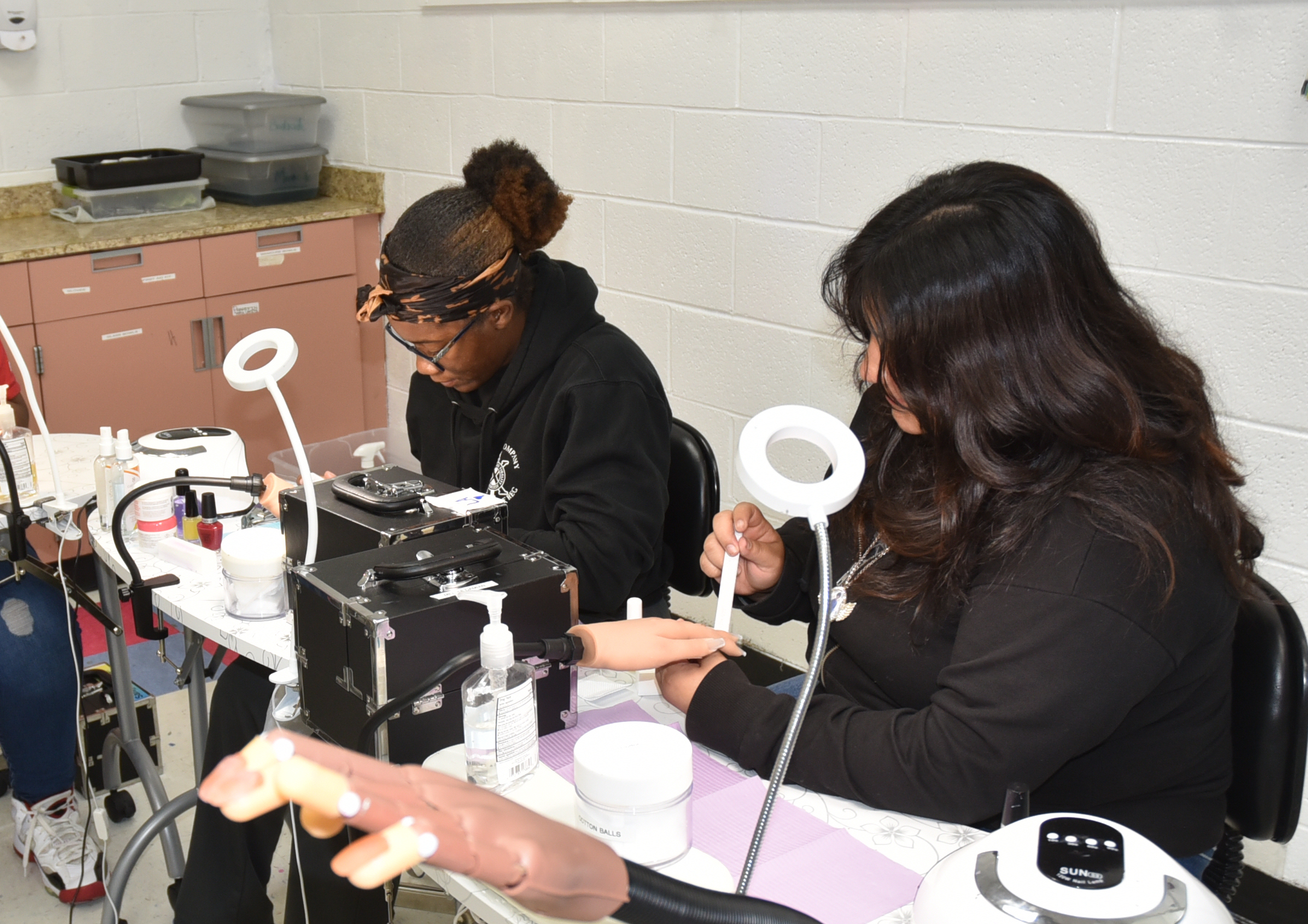 Nail Technolgy is a program that prepares individuals to shape fingernails and toenails, remove unwanted skin and blemishes, apply polish and cosmetics to nails, and function as licensed manicurists or nail technicians/specialists. Some of the senior nail techs are taking practical exams and theory exams that the school pays for the students.
