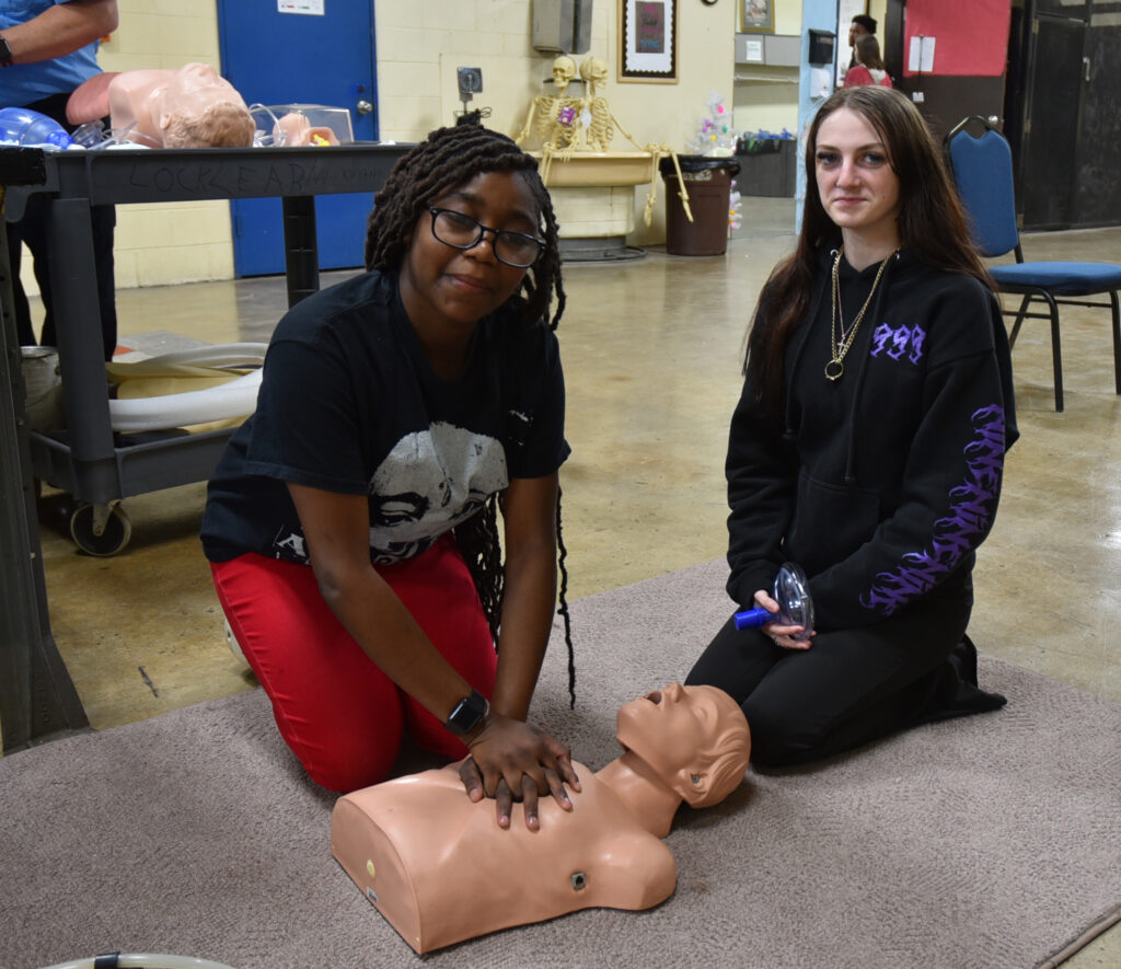 Pictured at Top: Two of the students, Sierra McDaniel and Azarih McLaughlin, performed traction splits and airways.