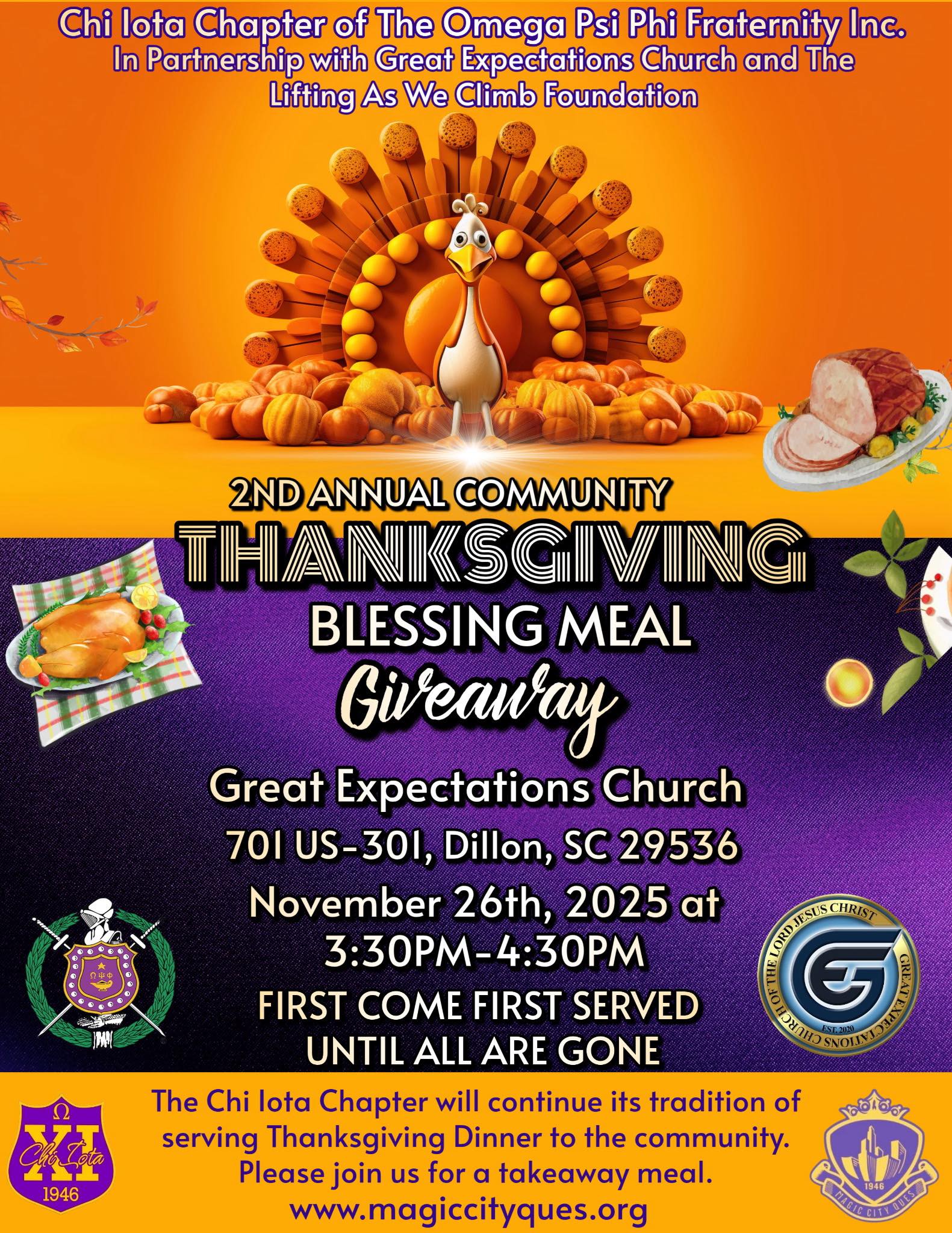 Join the Chi Iota Chapter of The Omega Psi Phi Fraternity, Inc., in partnership with Great Expectations Church and The Lifting As We Climb Foundation, for a Community Thanksgiving Blessing Meal Giveaway!