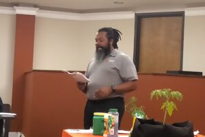 After Foxworth’s remarks, everyone had the opportunity to sample some tomato bruschetta that he prepared and to get their tomato plants so they can start planting.