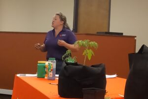 Guests received a number of free items including four tomatoes, growing bags, soil, a knee pad, a measuring cup, a portion plate, a tomato keeper, and more along with valuable information gained from the class by Carmen Ketron and Justin Foxworth. At the end, everyone got to try a tomato dish prepared by Foxworth.