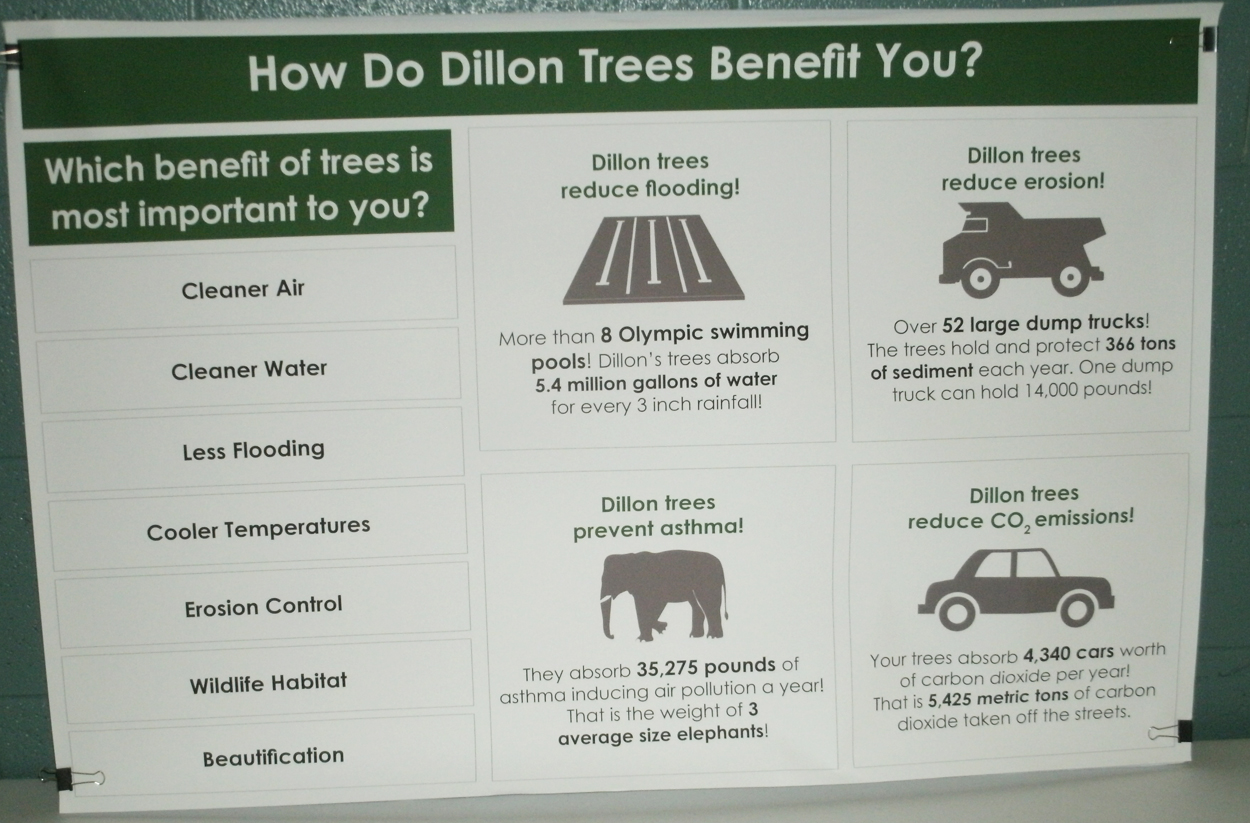 • Dillon’s trees reduce erosion by over 52 large dump trucks. The trees hold and protect 366 tons of sediment each year. One dump truck can hold 14,000 pounds.
