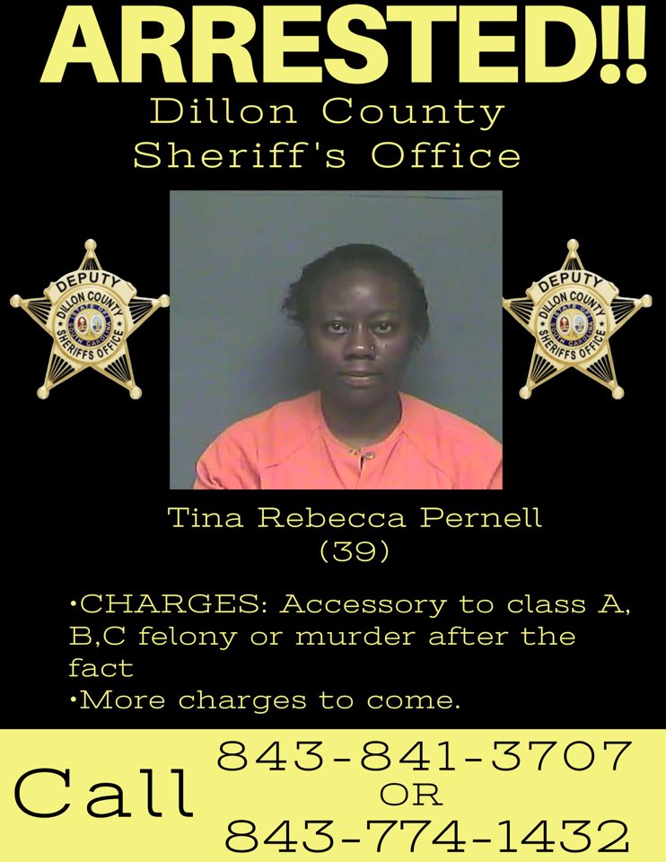 Detectives have charged and arrested Tina Rebecca Pernell, 39, of Hamer, with Accessory after the fact of Murder. She is being held in the Dillon County Detention Center.