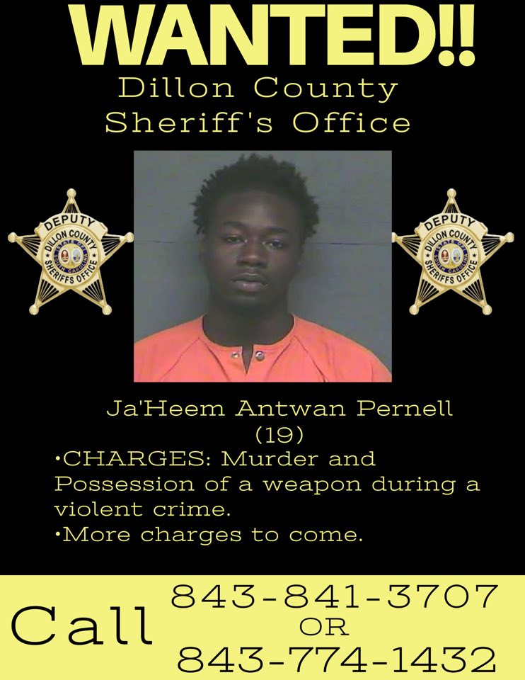Ja’Heem Antwan Pernell, 19, from Hamer, SC, is wanted for murder and possession of a weapon during a violent crime.