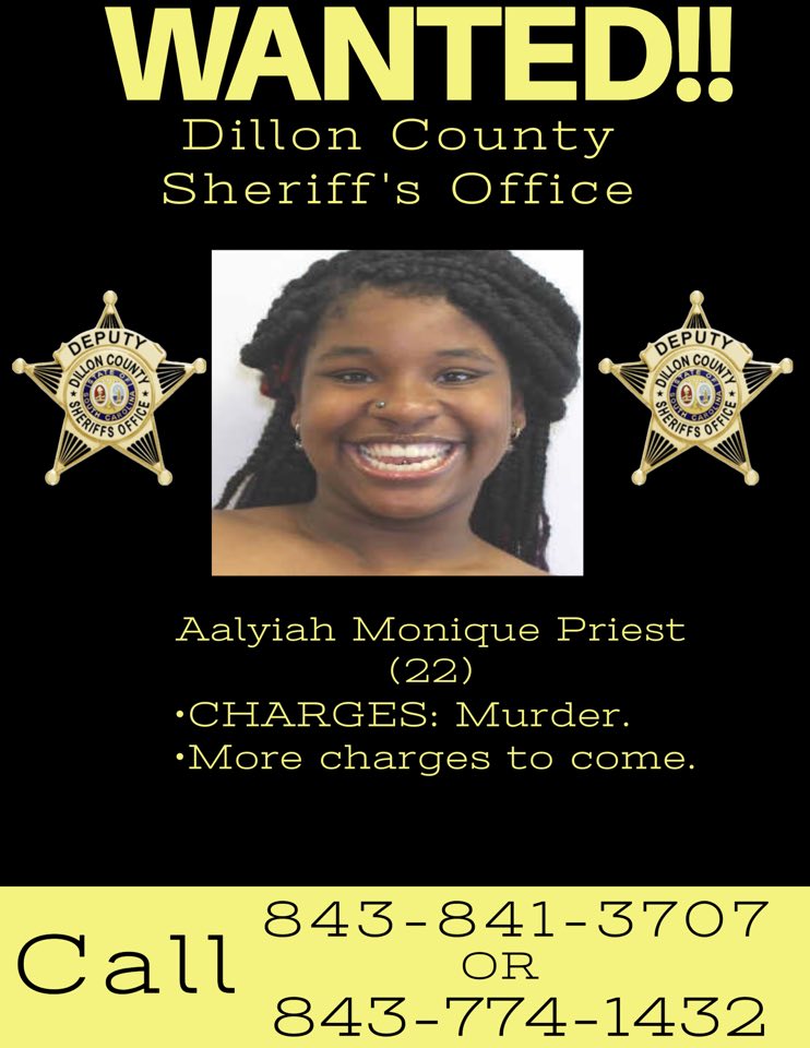 Aalyiah Monique Priest, 22, Hamer, SC is wanted for murder.