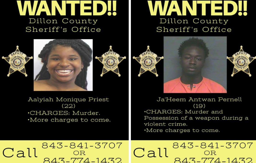 Aalyiah Monique Priest, 22, Hamer, SC is wanted for murder.