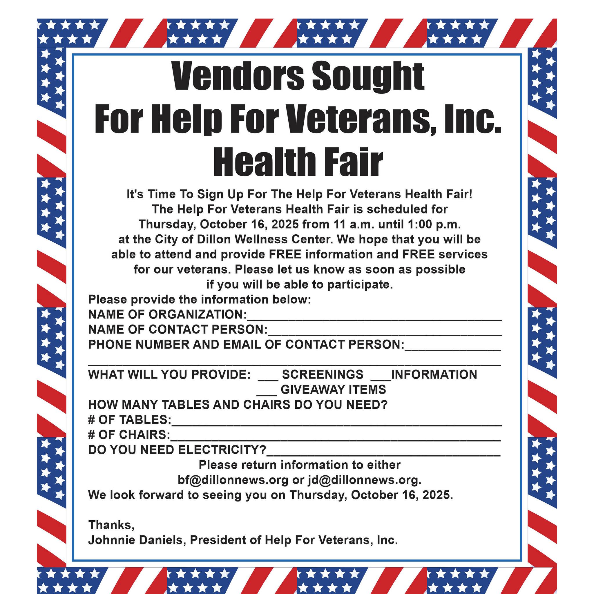 The Help For Veterans Health Fair is scheduled for Thursday, October 16, 2025 from 11 a.m. until 1:00 p.m. at the City of Dillon Wellness Center. We hope that you will be able to attend and provide free information and services for our veterans. Please let us know as soon as possible if you will be able to participate.