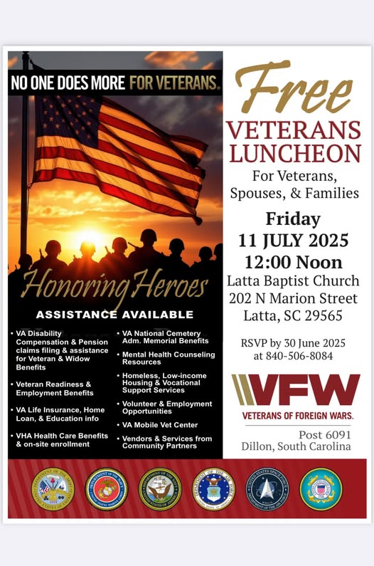 The Dillon VFW Post 6091 invites all Veterans and their dependents to join us for a luncheon at the Latta Baptist Church, located at 202 North Marion St., Latta, on July 11, 2025, from noon to 2:00 PM. This event aims to honor Veterans and their families by offering a complimentary meal, along with valuable information about various entitlements and benefits. Attendees will have the opportunity to engage with experts who can assist with military disability claims, VA healthcare eligibility and enrollment, employment opportunities, and other resources available to Veterans and their families in South Carolina. To reserve your seat, please call 843-506-8084. We look forward to seeing you there!