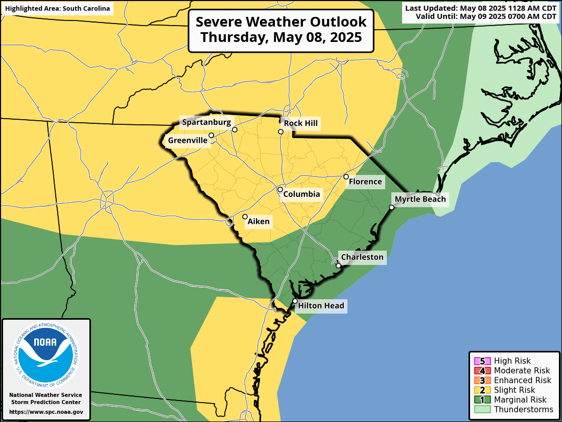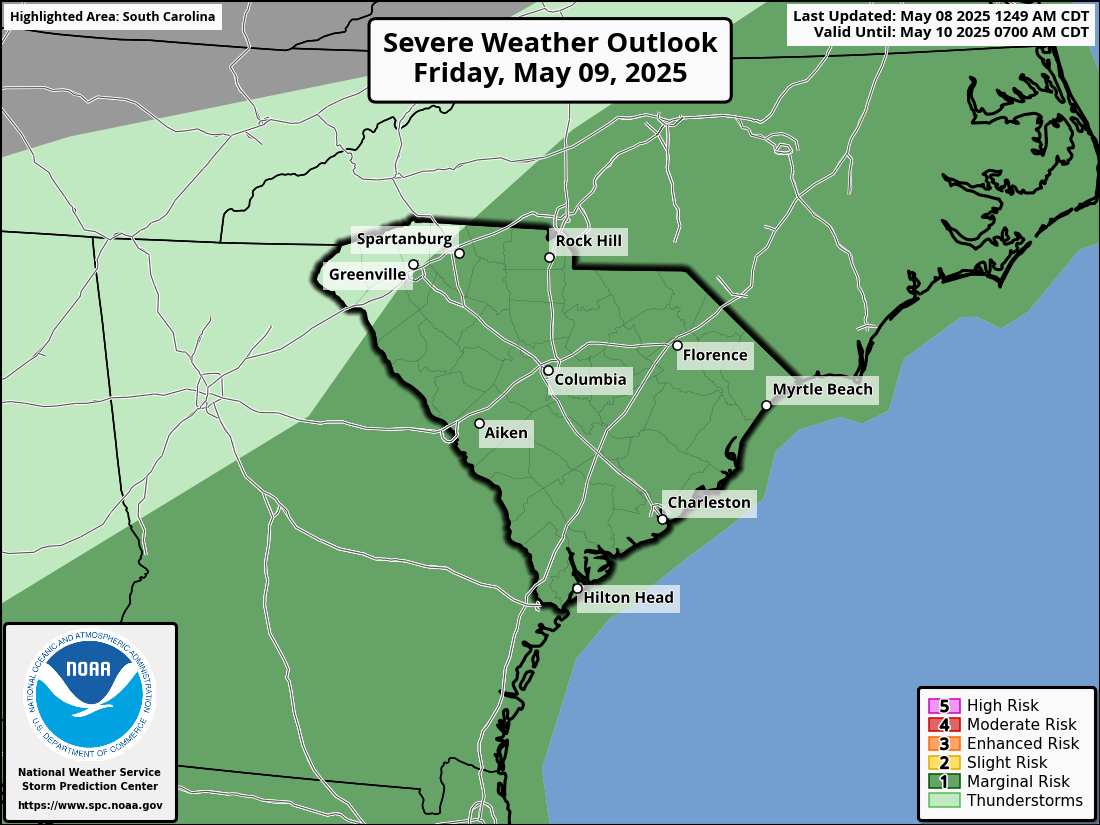 Friday will bring a cold front into South Carolina, causing our second round of locally severe thunderstorms. SPC has most of the state at a level 1 of 5 severe storm risk area.