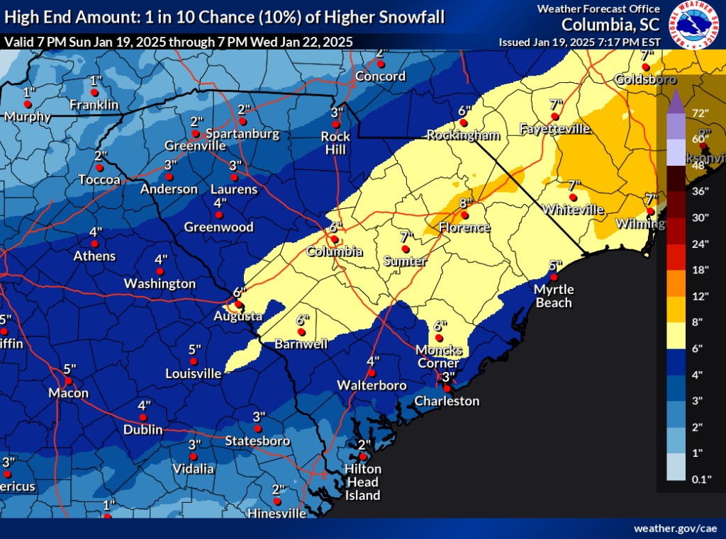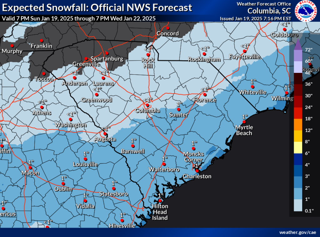 So, this time, our Coastal Plain sees the heaviest precipitation, with lesser amounts along I-20 and north. Parts of the Upstate may miss out on the snow. Below is the latest forecast from the National Weather Service on snowfall totals.
