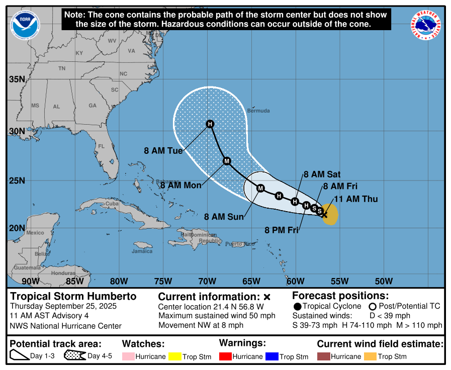 Humberto is also unlikely to threaten South Carolina directly. However, the National Hurricane Center’s (NHC) forecast calls for Humberto to become a Category 3 Hurricane over the western Atlantic before it gradually weakens and splits the Bermuda and Hatteras uprights around the middle of next week.