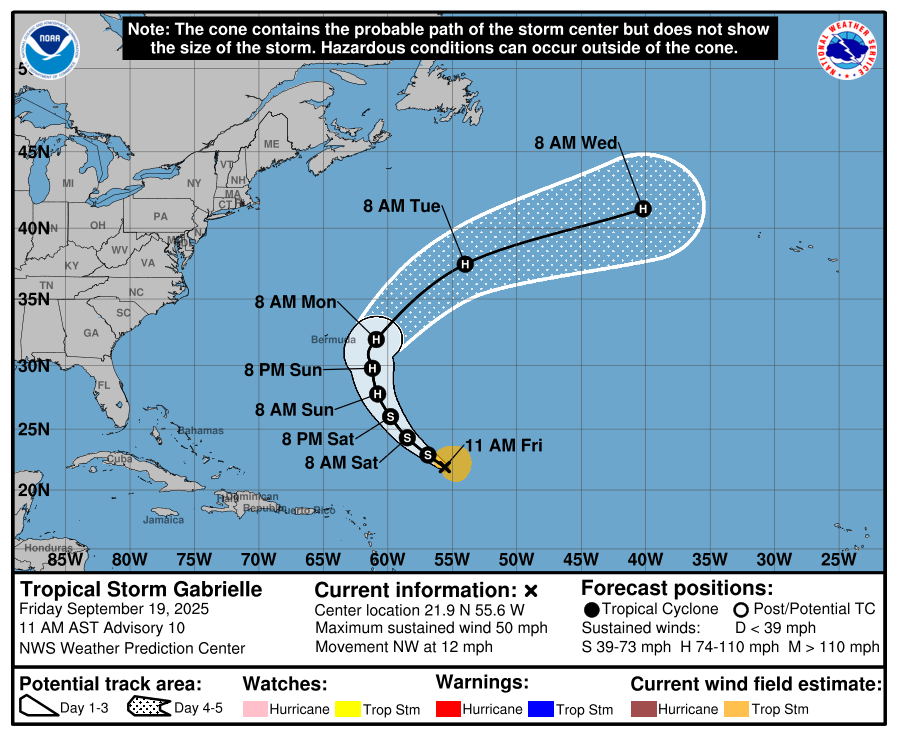 Gabrielle has been struggling against vertical wind shear and the dry air mass that it’s passing through. However, the wind shear will lessen starting today, so Gabrielle is likely to intensify over the weekend. The National Hurricane Center (NHC) calls for Gabrielle to be a hurricane by Sunday and then pass east of Bermuda on Monday.